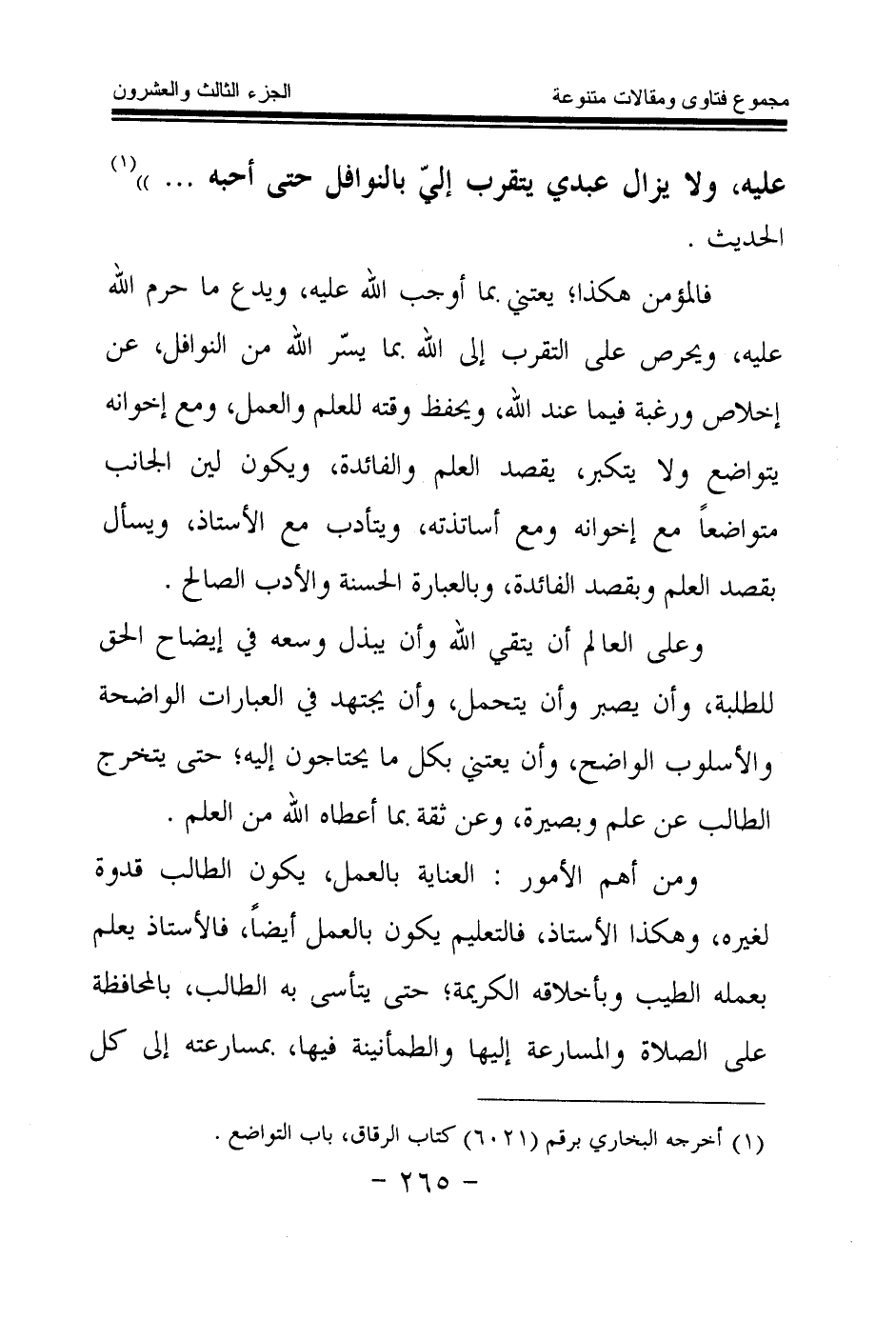 فالمؤمن هكذا، يعتني بما أوجب الله عليه، ويدع ما حرم الله عليه، ويحرص على التقرب إلى الله بما يسر الله من النوافل، عن إخلاص ورغبة فيما عند الله، ويحفظ وقته للعلم والعمل، ومع إخوانه يتواضع ولا يتكبر، يقصد العلم والفائدة، ويكون لين الجانب متواضعا مع إخوانه ومع أساتذته، ويتأدب مع الأستاذ، ويسأل بقصد العلم وبقصد الفائدة، وبالعبارة الحسنة والأدب الصالح.