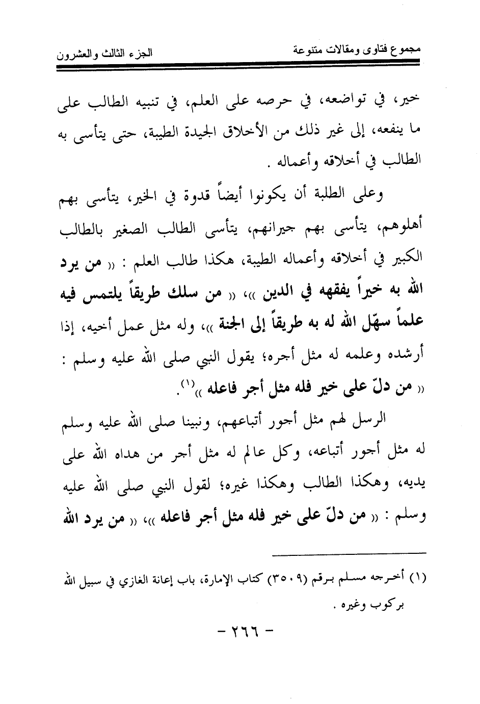 وعلى الطلبة أن يكونوا أيضا قدوة في الخير، يتأسى بهم أهلوهم، يتأسى بهم جيرانهم، يتأسى الطالب الصغير بالطالب الكبير في أخلاقه وأعماله الطيبة، هكذا طالب العلم: «من يرد الله به خيرا يفقهه في الدين (¬1) » ، «من سلك طريقا يلتمس فيه علما سهل الله له به طريقا إلى الجنة (¬2) » ، وله مثل عمل أخيه، إذا أرشده وعلمه له مثل أجره، يقول النبي صلى الله عليه وسلم: «من دل على خير فله مثل أجر فاعله (¬3) » .