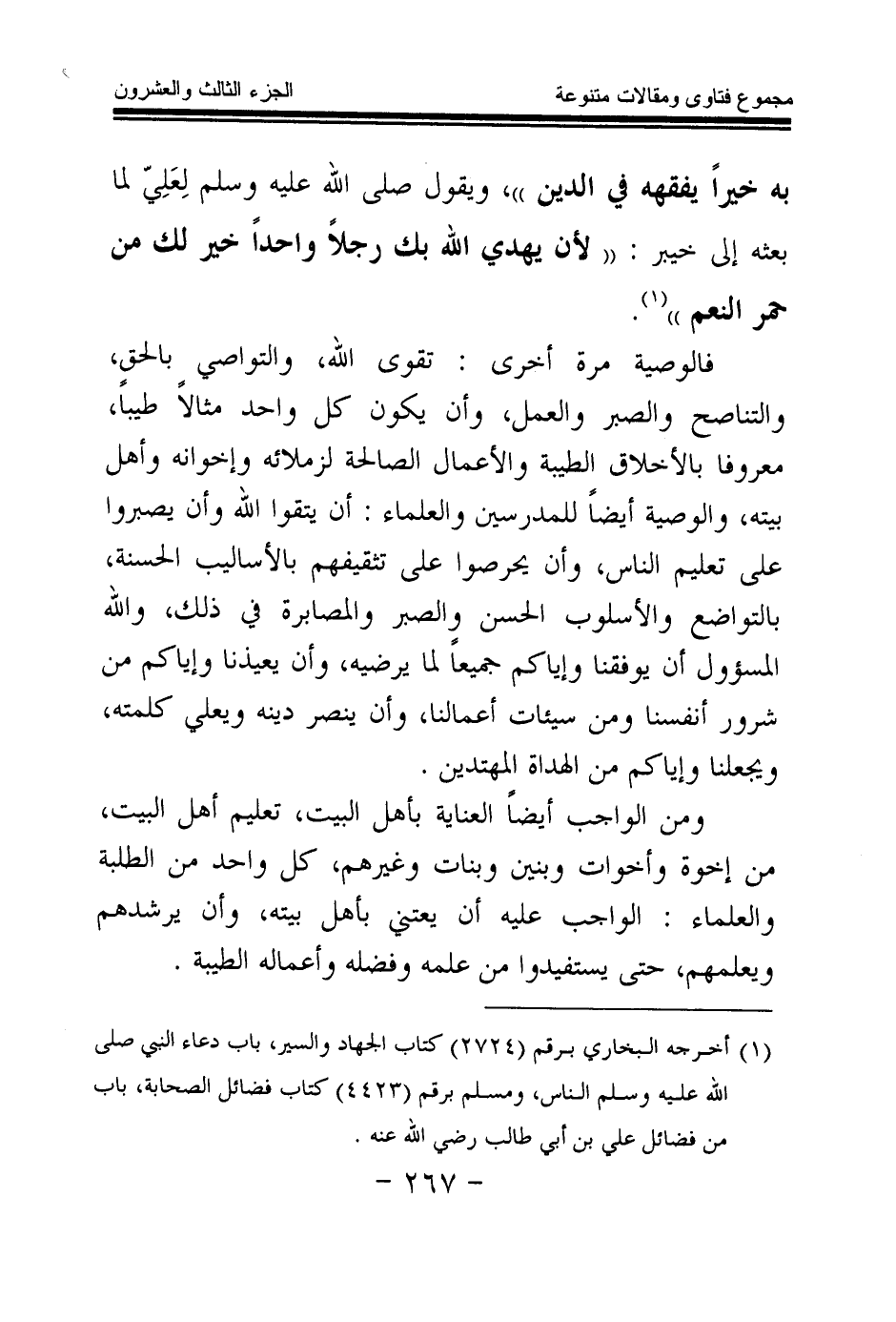 به خيرا يفقهه في الدين (¬1) » ، ويقول - صلى الله عليه وسلم - لعلي لما بعثه إلى خيبر: «لأن يهدي الله بك رجلا واحدا خير لك من حمر النعم (¬2) » .