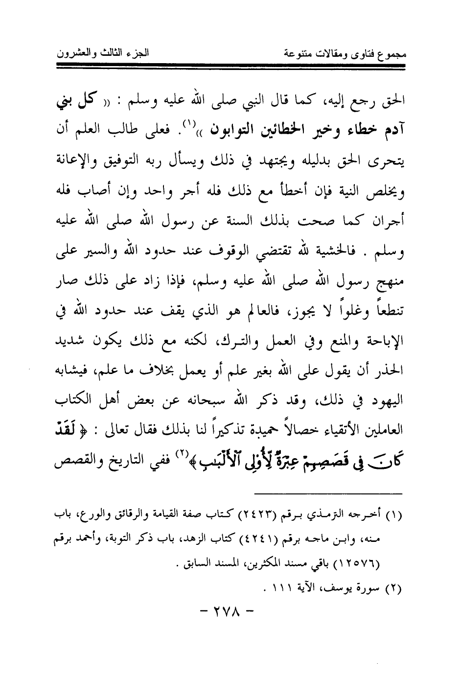 الحق رجع إليه، كما قال النبي صلى الله عليه وسلم: «كل بني آدم خطاء وخير الخطائين التوابون (¬1) » . فعلى طالب العلم أن يتحرى الحق بدليله ويجتهد في ذلك ويسأل ربه التوفيق والإعانة ويخلص النية فإن أخطأ مع ذلك فله أجر واحد وإن أصاب فله أجران كما صحت بذلك السنة عن رسول الله صلى الله عليه وسلم.