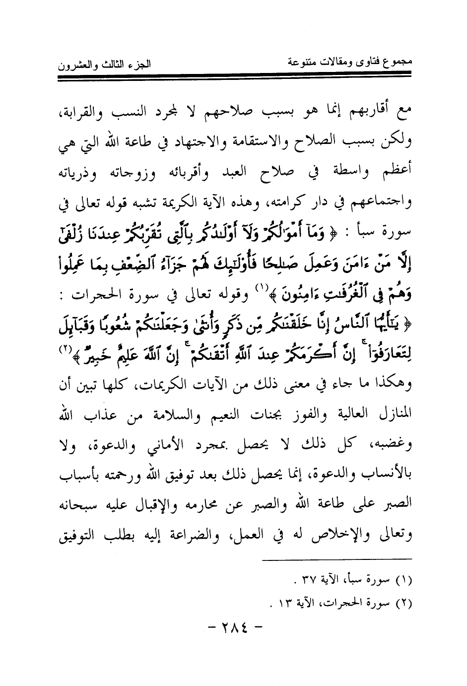 وقوله تعالى في سورة الحجرات: {يَا أَيُّهَا النَّاسُ إِنَّا خَلَقْنَاكُمْ مِنْ ذَكَرٍ وَأُنْثَى وَجَعَلْنَاكُمْ شُعُوبًا وَقَبَائِلَ لِتَعَارَفُوا إِنَّ أَكْرَمَكُمْ عِنْدَ اللَّهِ أَتْقَاكُمْ إِنَّ اللَّهَ عَلِيمٌ خَبِيرٌ} (¬2) وهكذا ما جاء في معنى ذلك من الآيات الكريمات، كلها تبين أن المنازل العالية والفوز بجنات النعيم والسلامة من عذاب الله وغضبه، كل ذلك لا يحصل بمجرد الأماني والدعوة ولا بالأنساب والدعوة إنما يحصل ذلك بعد توفيق الله ورحمته بأسباب الصبر على طاعة الله والصبر عن محارمه والإقبال عليه سبحانه وتعالى والإخلاص له في العمل والضراعة إليه بطلب التوفيق