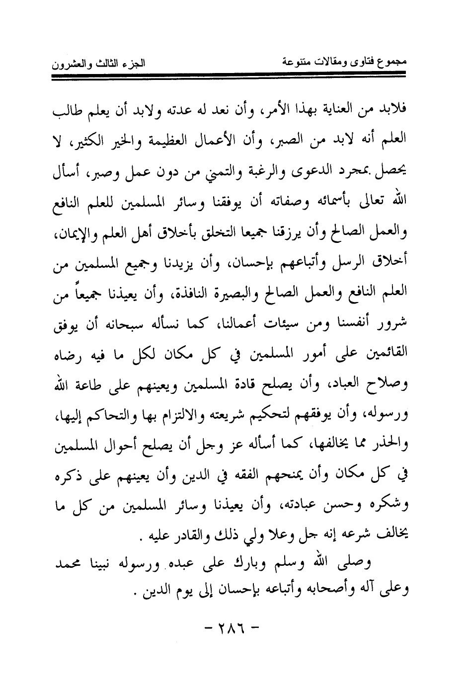 أسأل الله تعالى بأسمائه وصفاته أن يوفقنا وسائر المسلمين للعلم النافع والعمل الصالح وأن يرزقنا جميعا التخلق بأخلاق أهل العلم والإيمان، أخلاق الرسل وأتباعهم بإحسان، وأن يزيدنا وجميع المسلمين من العلم النافع والعمل الصالح والبصيرة النافذة، وأن يعيذنا جميعا من شرور أنفسنا ومن سيئات أعمالنا، كما نسأله سبحانه أن يوفق القائمين على أمور المسلمين في كل مكان لكل ما فيه رضاه وصلاح العباد وأن يصلح قادة المسلمين ويعينهم على طاعة الله ورسوله، وأن يوفقهم لتحكيم شريعته والالتزام بها والتحاكم إليها، والحذر مما يخالفها، كما أسأله عز وجل أن يصلح أحوال المسلمين في كل مكان وأن يمنحهم الفقه في الدين وأن يعينهم على ذكره وشكره وحسن عبادته، وأن يعيذنا وسائر المسلمين من كل ما يخالف شرعه إنه جل وعلا ولي ذلك والقادر عليه....