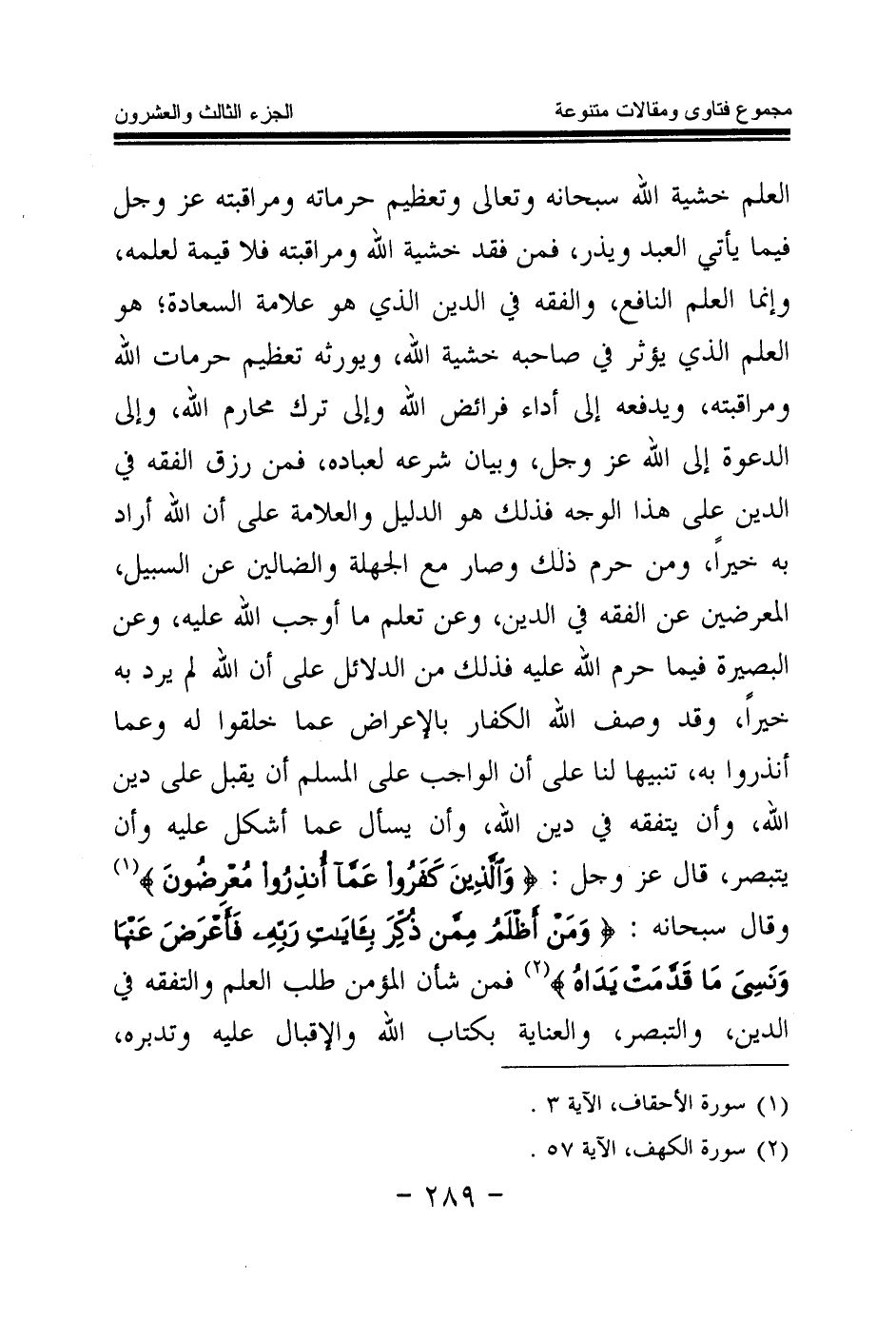 العلم خشية الله سبحانه وتعالى وتعظيم حرماته ومراقبته عز وجل فيما يأتي العبد ويذر، فمن فقد خشية الله ومراقبته فلا قيمة لعلمه، إنما العلم النافع، والفقه في الدين الذي هو علامة السعادة، هو العلم الذي يؤثر في صاحبه خشية الله، ويورثه تعظيم حرمات الله ومراقبته، ويدفعه إلى أداء فرائض الله وإلى ترك محارم الله، وإلى الدعوة إلى الله عز وجل، وبيان شرعه لعباده، فمن رزق الفقه في الدين على هذا الوجه فذلك هو الدليل والعلامة على أن الله أراد به خيرا، ومن حرم ذلك وصار مع الجهلة والضالين عن السبيل، المعرضين عن الفقه في الدين، وعن تعلم ما أوجب الله عليه، وعن البصيرة فيما حرم الله عليه فذلك من الدلائل على أن الله لم يرد به خيرا، وقد وصف الله الكفار بالإعراض عما خلقوا له وعما أنذروا به، تنبيها لنا على أن الواجب على المسلم أن يقبل على دين الله، وأن يتفقه في دين الله، وأن يسأل عما أشكل عليه وأن يتبصر، قال عز وجل: {وَالَّذِينَ كَفَرُوا عَمَّا أُنْذِرُوا مُعْرِضُونَ} (¬1) وقال سبحانه: {وَمَنْ أَظْلَمُ مِمَّنْ ذُكِّرَ بِآيَاتِ رَبِّهِ فَأَعْرَضَ عَنْهَا وَنَسِيَ مَا قَدَّمَتْ يَدَاهُ} (¬2)