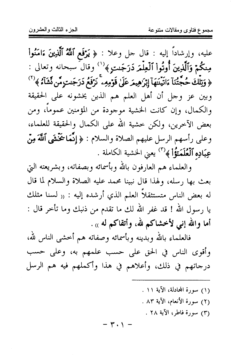 عليه، وإرشادا إليه: قال جل وعلا: {يَرْفَعِ اللَّهُ الَّذِينَ آمَنُوا مِنْكُمْ وَالَّذِينَ أُوتُوا الْعِلْمَ دَرَجَاتٍ} (¬1) وقال سبحانه وتعالى {وَتِلْكَ حُجَّتُنَا آتَيْنَاهَا إِبْرَاهِيمَ عَلَى قَوْمِهِ نَرْفَعُ دَرَجَاتٍ مَنْ نَشَاءُ} (¬2) وبين عز وجل أن أهل العلم هم الذين يخشونه على الحقيقة والكمال، وإن كانت الخشية موجودة من المؤمنين عموما، ومن بعض الآخرين، ولكن خشية الله على الكمال والحقيقة للعلماء، وعلى رأسهم الرسل - عليهم الصلاة والسلام -: {إِنَّمَا يَخْشَى اللَّهَ مِنْ عِبَادِهِ الْعُلَمَاءُ} (¬3) يعني: الخشية الكاملة.