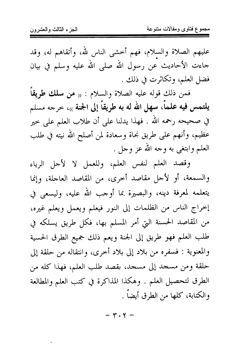 فمن ذلك قوله - عليه الصلاة والسلام -: «من سلك طريقا يلتمس فيه علما سهل الله له به طريقا إلى الجنة (¬1) » خرجه مسلم في صحيحه - رحمه الله -. فهذا يدلنا على أن طلاب العلم على خير عظيم، وأنهم على طريق نجاة وسعادة لمن أصلح الله نيته في طلب العلم وابتغى به وجه الله عز وجل، وقصد العلم لنفس العلم، وللعمل، لا لأجل الرياء والسمعة، أو لأجل مقاصد أخرى، من المقاصد العاجلة، وإنما يتعلمه لمعرفة دينه، والبصيرة بما أوجب الله عليه، وليسعى في إخراج الناس من الظلمات إلى النور فيعلم ويعمل ويعلم غيره من المقاصد الحسنة التي أمر المسلم بها، فكل طريق يسلكه في طلب العلم فهو طريق إلى الجنة، ويعم ذلك جميع الطرق الحسية والمعنوية: فسفره من بلاد إلى بلاد أخرى، وانتقاله له من حلقة إلى حلقة ومن مسجد إلى مسجد بقصد طلب العلم، فهذا كله من الطرق لتحصيل العلم. وهكذا المذاكرة في كتب العلم والمطالعة والكتابة، كلها من الطرق أيضا.