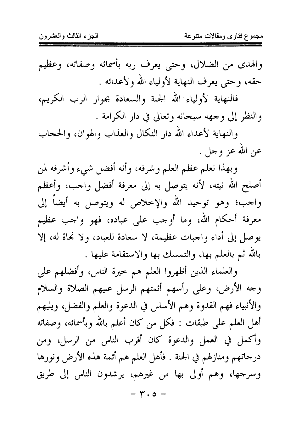 وبهذا نعلم عظم العلم وشرفه، وأنه أفضل شيء وأشرفه لمن أصلح الله نيته؛ لأنه يتوصل به إلى معرفة أفضل واجب، وأعظم واجب، وهو توحيد الله والإخلاص له، ويتوصل به أيضا إلى معرفة أحكام الله، وما أوجب على عباده، فهو واجب عظيم يوصل إلى أداء واجبات عظيمة، لا سعادة للعبد، ولا نجاة لهم، إلا بالله ثم بالعلم بها، والتمسك بها والاستقامة عليها.
