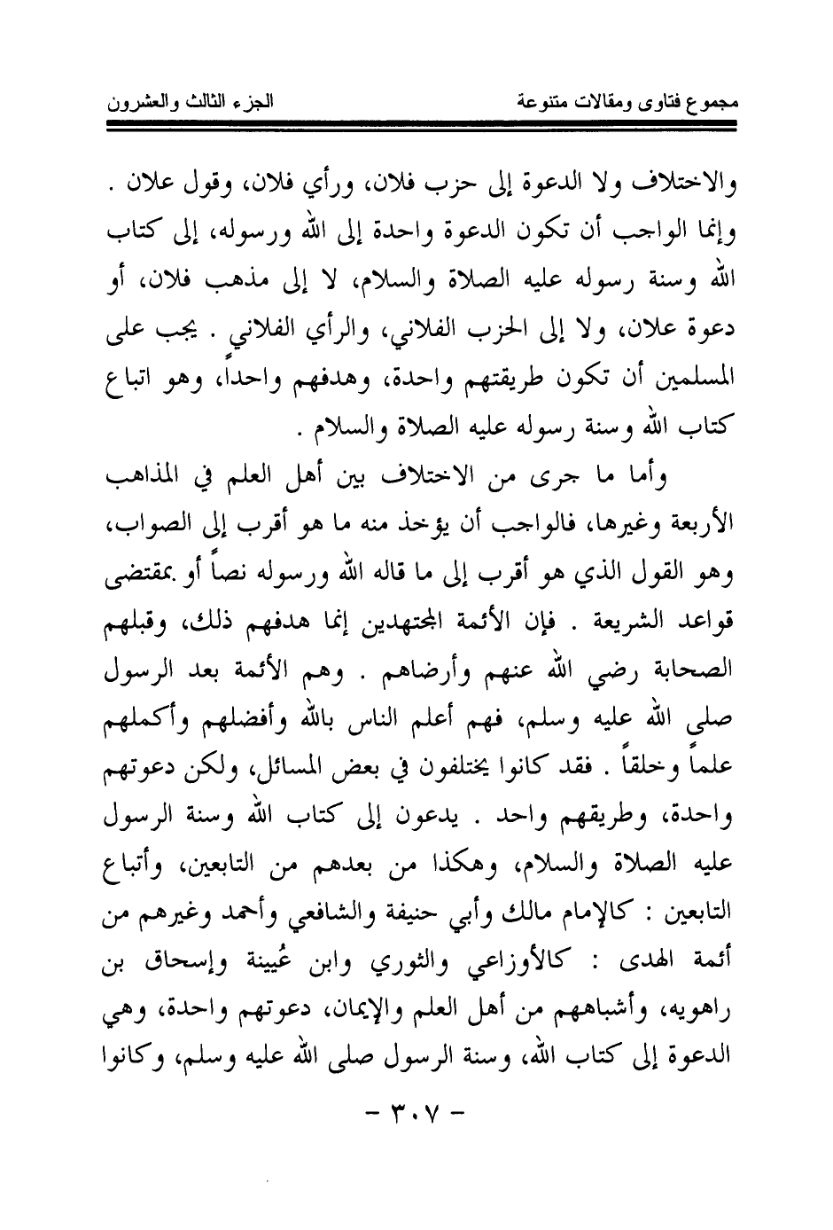 والاختلاف ولا الدعوة إلى حزب فلان وحزب فلان، ورأي فلان، وقول علان. وإنما الواجب أن تكون الدعوة واحدة إلى الله ورسوله، إلى كتاب الله وسنة رسوله - عليه الصلاة والسلام -، لا إلى مذهب فلان، أو دعوة علان، ولا إلى الحزب الفلاني، والرأي الفلاني. يجب على المسلمين أن تكون طريقتهم واحدة، وهدفهم واحدا، وهو اتباع كتاب الله وسنة رسوله - عليه الصلاة والسلام -.