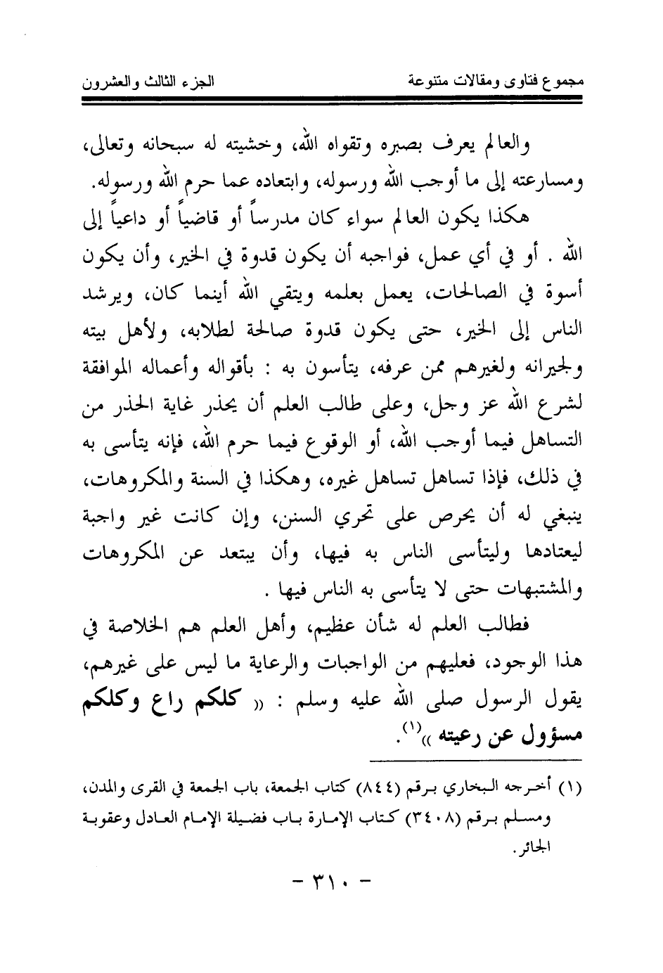 فطالب العلم له شأن عظيم، وأهل العلم هم الخلاصة في هذا الوجود، فعليهم من الواجبات والرعاية ما ليس على غيرهم، يقول الرسول - صلى الله عليه وسلم -: «كلكم راع وكلكم مسئول عن رعيته (¬1) » .