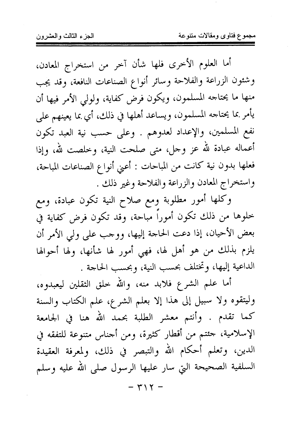 أما العلوم الأخرى فلها شأن آخر من استخراج المعادن، وشئون الزراعة والفلاحة وسائر أنواع الصناعات النافعة، وقد يجب منها ما يحتاجه المسلمون، ويكون فرض كفاية، ولولي الأمر فيها أن يأمر بما يحتاجه المسلمون، ويساعد أهلها في ذلك، أي بما يعينهم على نفع المسلمين، والإعداد لعدوهم. وعلى حسب نية العبد تكون أعماله عبادة لله عز وجل، متى صلحت النية، وخلصت لله، وإذا فعلها بدون نية كانت من المباحات؛ أعني: أنواع الصناعات المباحة، واستخراج المعادن والزراعة والفلاحة وغير ذلك.
