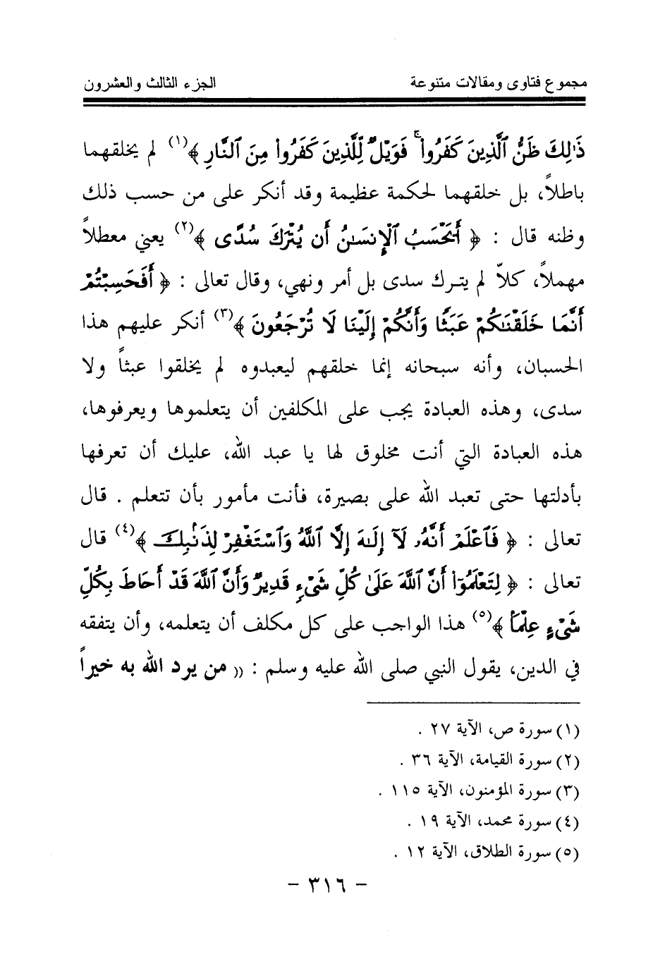 لم يخلقهما باطلا، بل خلقهما لحكمة عظيمة وقد أنكر على من حسب ذلك وظنه قال: {أَيَحْسَبُ الْإِنْسَانُ أَنْ يُتْرَكَ سُدًى} (¬1) يعني معطلا مهملا، كلا لم يترك سدى بل أمر ونهي، وقال تعالى: {أَفَحَسِبْتُمْ أَنَّمَا خَلَقْنَاكُمْ عَبَثًا وَأَنَّكُمْ إِلَيْنَا لَا تُرْجَعُونَ} (¬2) أنكر عليهم هذا الحسبان، وأنه سبحانه إنما خلقهم ليعبدوه لم يخلقوا عبثا ولا سدى، وهذه العبادة يجب على المكلفين أن يتعلموها ويعرفوها، هذه العبادة التي أنت مخلوق لها يا عبد الله، عليك أن تعرفها بأدلتها حتى تعبد الله على بصيرة، فأنت مأمور بأن تتعلم. قال تعالى: {فَاعْلَمْ أَنَّهُ لَا إِلَهَ إِلَّا اللَّهُ وَاسْتَغْفِرْ لِذَنْبِكَ} (¬3) قال تعالى: {لِتَعْلَمُوا أَنَّ اللَّهَ عَلَى كُلِّ شَيْءٍ قَدِيرٌ وَأَنَّ اللَّهَ قَدْ أَحَاطَ بِكُلِّ شَيْءٍ عِلْمًا} (¬4) هذا الواجب على كل مكلف أن يتعلمه، وأن يتفقه في الدين، يقول النبي صلى الله عليه وسلم: «من يرد الله به خيرا