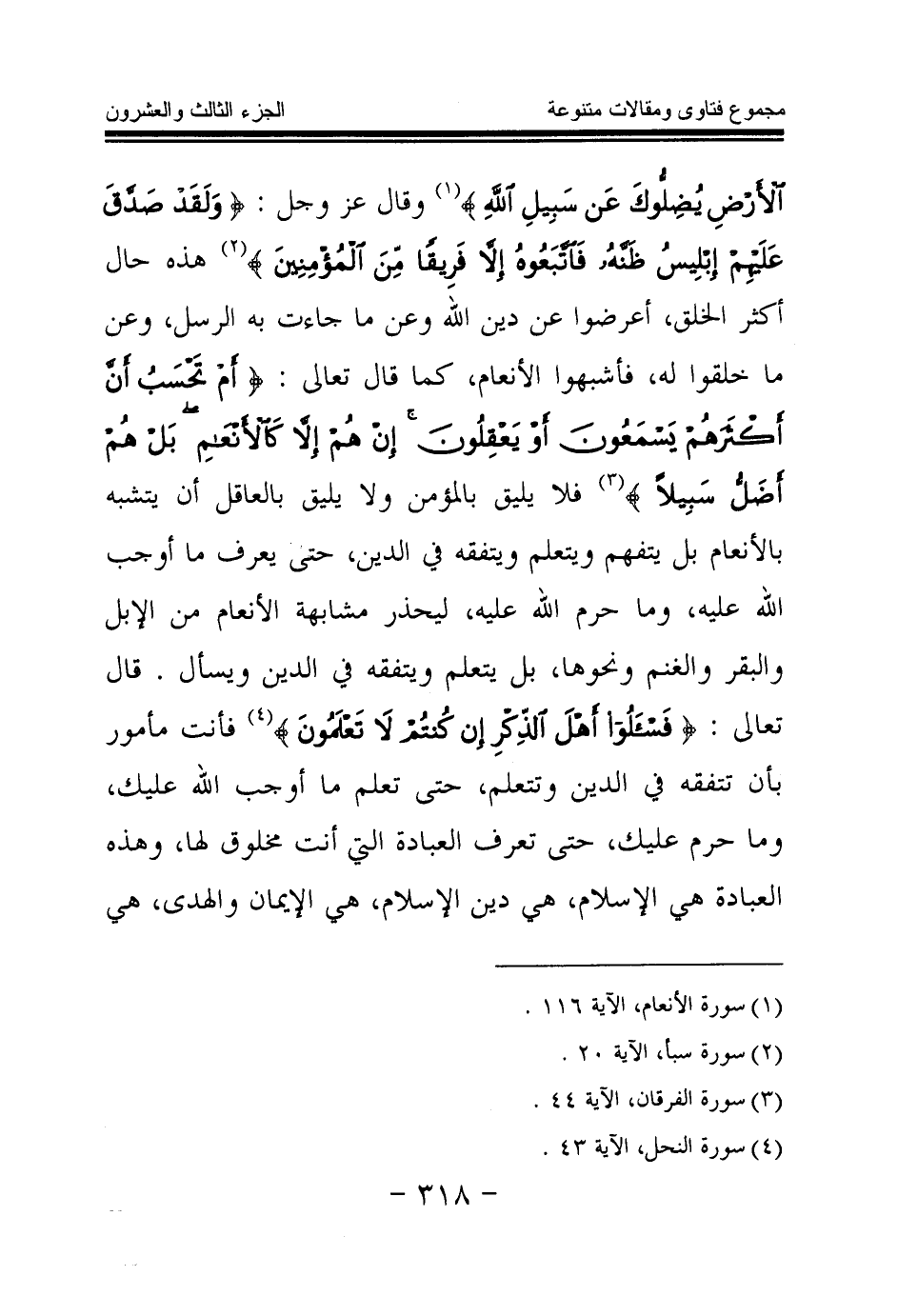 وقال عز وجل: {وَلَقَدْ صَدَّقَ عَلَيْهِمْ إِبْلِيسُ ظَنَّهُ فَاتَّبَعُوهُ إِلَّا فَرِيقًا مِنَ الْمُؤْمِنِينَ} (¬1) هذه حال أكثر الخلق، أعرضوا عن دين الله وعن ما جاءت به الرسل، وعن ما خلقوا له، فأشبهوا الأنعام، كما قال تعالى: {أَمْ تَحْسَبُ أَنَّ أَكْثَرَهُمْ يَسْمَعُونَ أَوْ يَعْقِلُونَ إِنْ هُمْ إِلَّا كَالْأَنْعَامِ بَلْ هُمْ أَضَلُّ سَبِيلًا} (¬2) فلا يليق بالمؤمن ولا يليق بالعاقل أن يتشبه بالأنعام، بل يتفهم ويتعلم ويتفقه في الدين، حتى يعرف ما أوجب الله عليه، وما حرم الله عليه، ليحذر مشابهة الأنعام من الإبل والبقر والغنم ونحوها، بل يتعلم ويتفقه في الدين ويسأل. قال تعالى: {فَاسْأَلُوا أَهْلَ الذِّكْرِ إِنْ كُنْتُمْ لَا تَعْلَمُونَ} (¬3) فأنت مأمور بأن تتفقه في الدين وتتعلم، حتى تعلم ما أوجب الله عليك، وما حرم عليك، حتى تعرف العبادة التي أنت مخلوق لها، وهذه العبادة هي الإسلام، هي دين الإسلام، هي الإيمان والهدى، هي