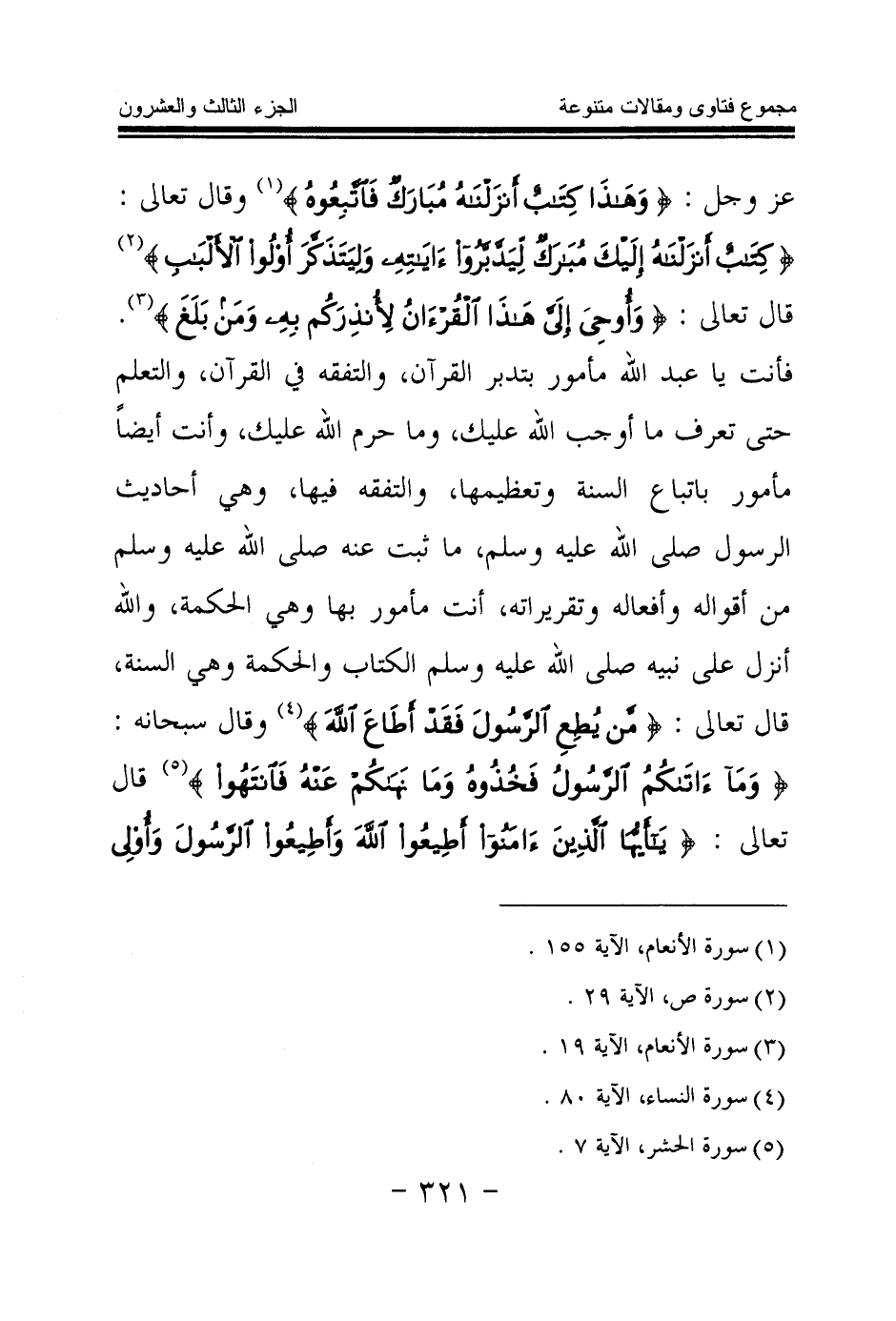 عز وجل: {وَهَذَا كِتَابٌ أَنْزَلْنَاهُ مُبَارَكٌ فَاتَّبِعُوهُ} (¬1) وقال تعالى: {كِتَابٌ أَنْزَلْنَاهُ إِلَيْكَ مُبَارَكٌ لِيَدَّبَّرُوا آيَاتِهِ وَلِيَتَذَكَّرَ أُولُو الْأَلْبَابِ} (¬2) قال تعالى: {وَأُوحِيَ إِلَيَّ هَذَا الْقُرْآنُ لِأُنْذِرَكُمْ بِهِ وَمَنْ بَلَغَ} (¬3) فأنت يا عبد الله مأمور بتدبر القرآن، والتفقه في القرآن، والتعلم حتى تعرف ما أوجب الله عليك، وما حرم الله عليك، وأنت أيضا مأمور باتباع السنة وتعظيمها، والتفقه فيها، وهي أحاديث الرسول صلى الله عليه وسلم، ما ثبت عنه صلى الله عليه وسلم من أقواله وأفعاله وتقريراته، أنت مأمور بها وهي الحكمة، والله أنزل على نبيه صلى الله عليه وسلم الكتاب والحكمة وهي السنة، قال تعالى: {مَنْ يُطِعِ الرَّسُولَ فَقَدْ أَطَاعَ اللَّهَ} (¬4) وقال سبحانه: {وَمَا آتَاكُمُ الرَّسُولُ فَخُذُوهُ وَمَا نَهَاكُمْ عَنْهُ فَانْتَهُوا} (¬5) قال تعالى: {يَا أَيُّهَا الَّذِينَ آمَنُوا أَطِيعُوا اللَّهَ وَأَطِيعُوا الرَّسُولَ وَأُولِي الْأَمْرِ مِنْكُمْ فَإِنْ تَنَازَعْتُمْ فِي شَيْءٍ فَرُدُّوهُ إِلَى اللَّهِ وَالرَّسُولِ} (¬6)