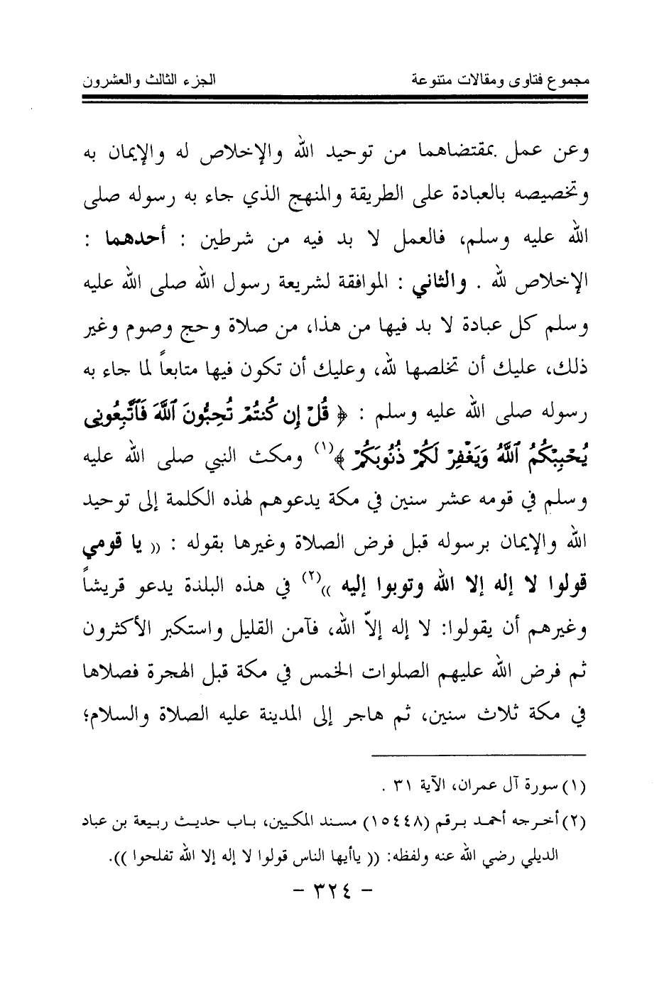 والثاني: الموافقة لشريعة رسول الله صلى الله عليه وسلم كل عبادة لا بد فيها من هذا، من صلاة وحج وصوم وغير ذلك، عليك أن تخلصها لله، وعليك أن تكون فيها متابعا لما جاء به رسوله صلى الله عليه وسلم: {قُلْ إِنْ كُنْتُمْ تُحِبُّونَ اللَّهَ فَاتَّبِعُونِي يُحْبِبْكُمُ اللَّهُ وَيَغْفِرْ لَكُمْ ذُنُوبَكُمْ} (¬1) ومكث النبي صلى الله عليه وسلم في قومه عشر سنين في مكة يدعوهم لهذه الكلمة إلى توحيد الله والإيمان برسوله قبل فرض الصلاة وغيرها بقوله: «يا قومي قولوا لا إله إلا الله وتوبوا إليه (¬2) » في هذه البلدة يدعو قريشا وغيرهم أن يقولوا: لا إله إلا الله، فآمن القليل واستكبر الأكثرون ثم فرض الله عليهم الصلوات الخمس في مكة قبل الهجرة فصلاها في مكة ثلاث سنين، ثم هاجر إلى المدينة عليه الصلاة والسلام،