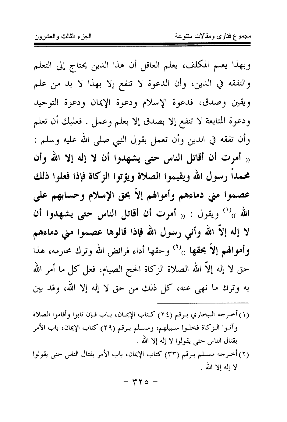 وبهذا يعلم المكلف، يعلم العاقل أن هذا الدين يحتاج إلى التعلم والتفقه في الدين، وأن الدعوة لا تنفع إلا بهذا لا بد من علم ويقين وصدق، فدعوة الإسلام ودعوة الإيمان ودعوة التوحيد ودعوة المتابعة لا تنفع إلا بصدق، إلا بعلم وعمل، فعليك أن تعلم، وأن تفقه في الدين، وأن تعمل بقول النبي صلى الله عليه وسلم: «أمرت أن أقاتل الناس حتى يشهدوا أن لا إله إلا الله وأن محمدا رسول الله ويقيموا الصلاة ويؤتوا الزكاة فإذا فعلوا ذلك عصموا منهي دماءهم وأموالهم إلا بحق الإسلام وحسابهم على الله (¬1) » ويقول: «أمرت أن أقاتل الناس حتى يشهدوا أن لا إله إلا الله وأني رسول الله فإذا قالوها عصموا مني دماءهم وأموالهم إلا بحقها (¬2) » وحقها أداء فرائض الله وترك محارمه، هذا حق لا إله إلا الله الصلاة، الزكاة، الحج، الصيام، فعل كل ما أمر الله به وترك ما نهى عنه، كل ذلك من حق لا إله إلا الله، وقد بين
