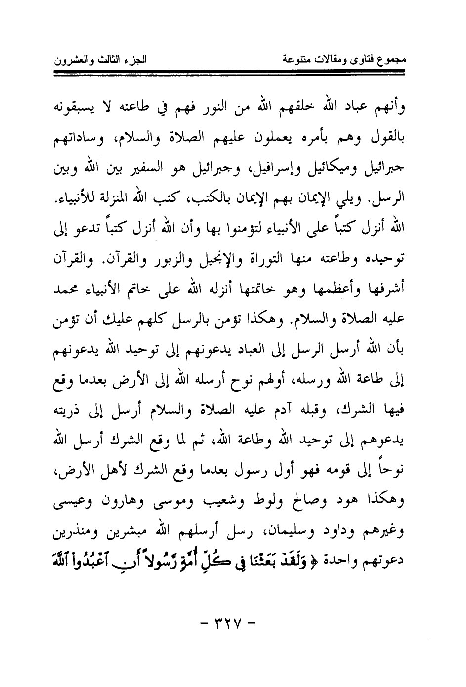وأنهم عباد الله خلقهم الله من النور فهم في طاعته لا يسبقونه بالقول وهم بأمره يعملون عليهم الصلاة والسلام، وساداتهم جبرائيل وميكائيل وإسرافيل، وجبرائيل هو السفير بين الله وبين الرسل.
