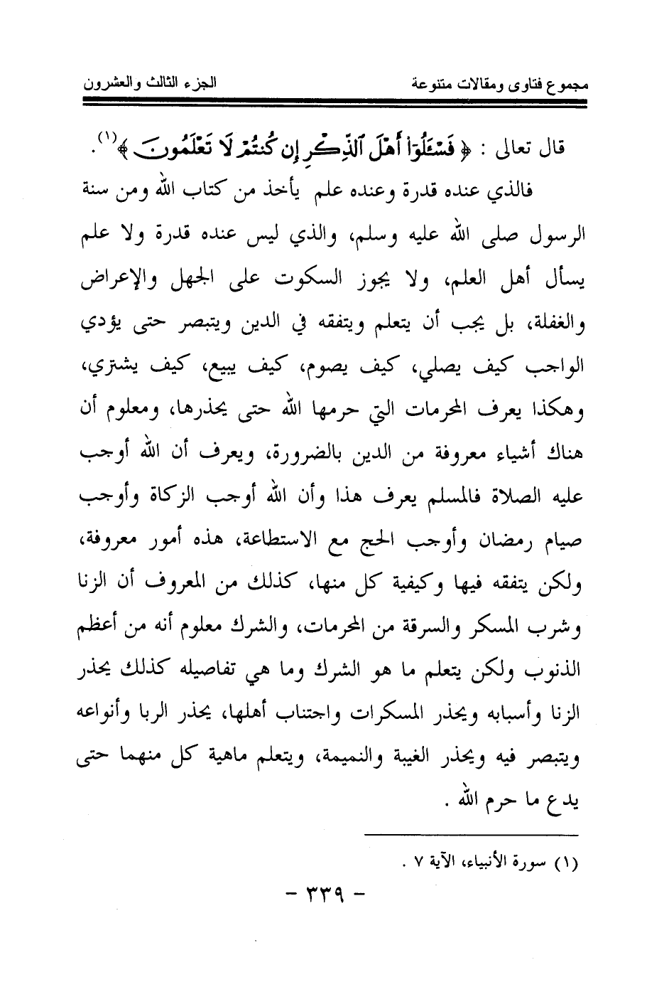 قال تعالى: {فَاسْأَلُوا أَهْلَ الذِّكْرِ إِنْ كُنْتُمْ لَا تَعْلَمُونَ} (¬1) فالذي عنده قدرة وعنده علم يأخذ من كتاب الله ومن سنة الرسول صلى الله عليه وسلم، والذي ليس عنده قدرة ولا علم يسأل أهل العلم، ولا يجوز السكوت على الجهل والإعراض والغفلة، بل يجب أن يتعلم ويتفقه في الدين ويتبصر حتى يؤدي الواجب كيف يصلي، كيف يصوم، كيف يبيع، كيف يشتري، وهكذا يعرف المحرمات التي حرمها الله حتى يحذرها، ومعلوم أن هناك أشياء معروفة من الدين بالضرورة، ويعرف أن الله أوجب عليه الصلاة، فالمسلم يعرف هذا، وأن الله أوجب الزكاة وأوجب صيام رمضان وأوجب الحج مع الاستطاعة، هذه أمور معروفة، ولكن يتفقه فيها وكيفية كل منها، كذلك من المعروف أن الزنا وشرب المسكر والسرقة من المحرمات، والشرك معلوم أنه من أعظم الذنوب، ولكن يتعلم ما هو الشرك وما هي تفاصيله كذلك يحذر الزنا وأسبابه، ويحذر المسكرات واجتناب أهلها، يحذر الربا وأنواعه ويتبصر فيه ويحذر الغيبة والنميمة، ويتعلم ماهية كل منهما حتى يدع ما حرم الله.