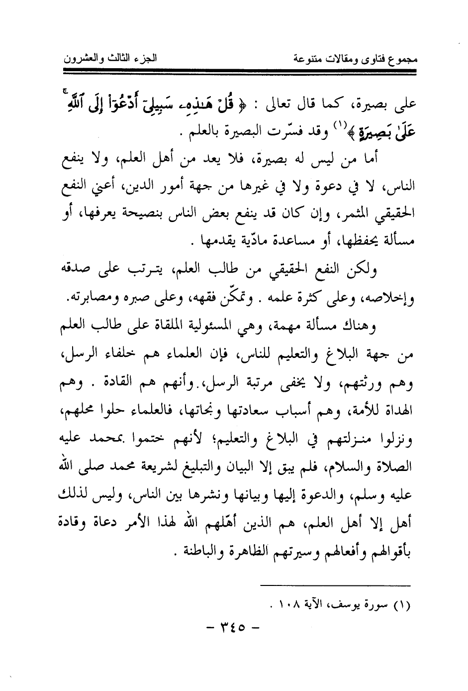 أما من ليس له بصيرة، فلا يعد من أهل العلم، ولا ينفع الناس، لا في دعوة ولا في غيرها من جهة أمور الدين، أعني النفع الحقيقي المثمر، وإن كان قد ينفع بعض الناس بنصيحة يعرفها، أو مسألة يحفظها، أو مساعدة مادية يقدمها.