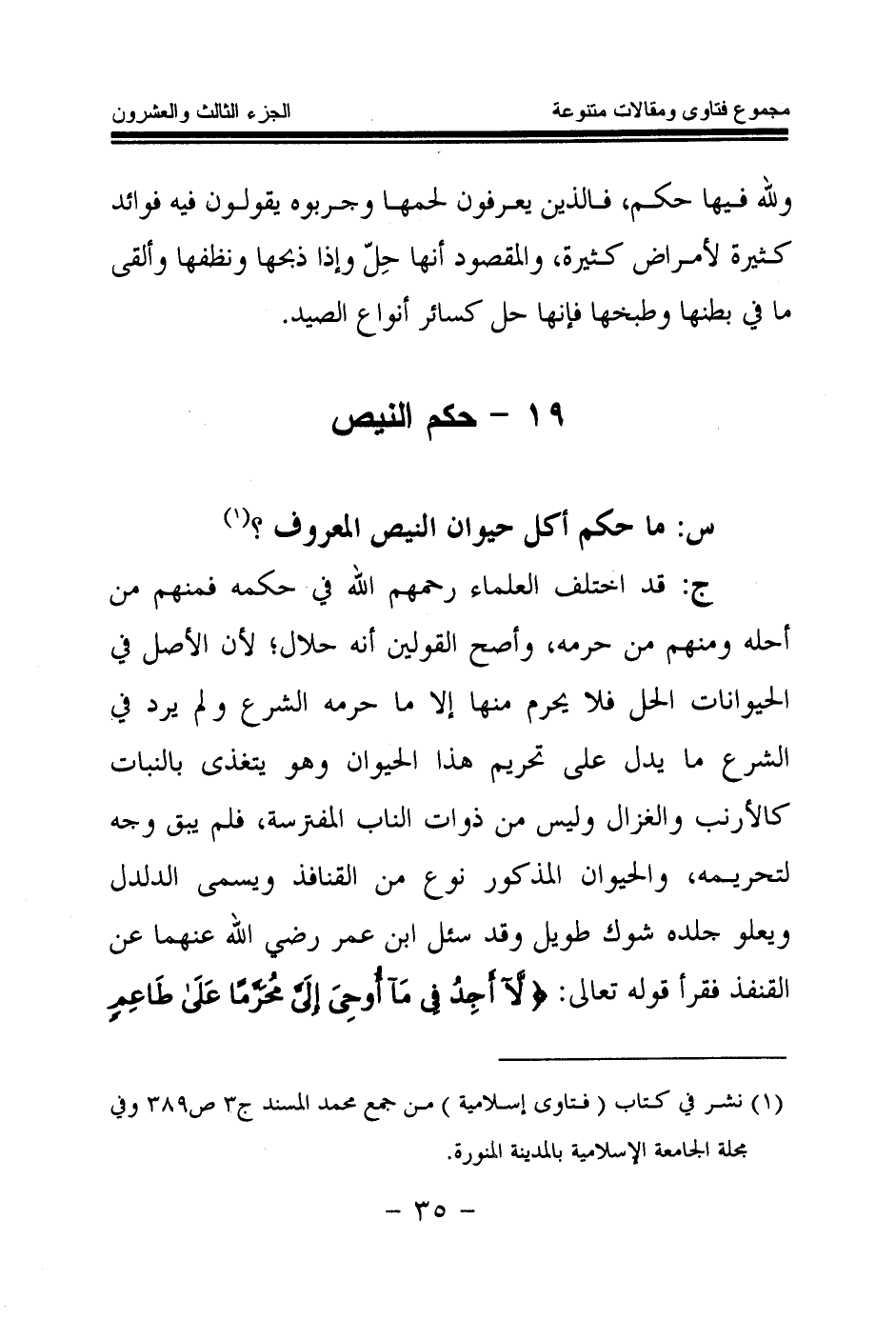 ج: قد اختلف العلماء رحمهم الله في حكمه فمنهم من أحله ومنهم من حرمه، وأصح القولين أنه حلال؛ لأن الأصل في الحيوانات الحل فلا يحرم منها إلا ما حرمه الشرع ولم يرد في الشرع ما يدل على تحريم هذا الحيوان وهو يتغذى بالنبات كالأرنب والغزال وليس من ذوات الناب المفترسة، فلم يبق وجه لتحريمه، والحيوان المذكور نوع من القنافذ ويسمى الدلدل ويعلو جلده شوك طويل وقد سئل ابن عمر رضي الله عنهما عن القنفذ فقرأ قوله تعالى: {قُلْ لَا أَجِدُ فِي مَا أُوحِيَ إِلَيَّ مُحَرَّمًا عَلَى طَاعِمٍ يَطْعَمُهُ إِلَّا أَنْ يَكُونَ مَيْتَةً أَوْ دَمًا مَسْفُوحًا أَوْ لَحْمَ خِنْزِيرٍ} (¬1) الآية.