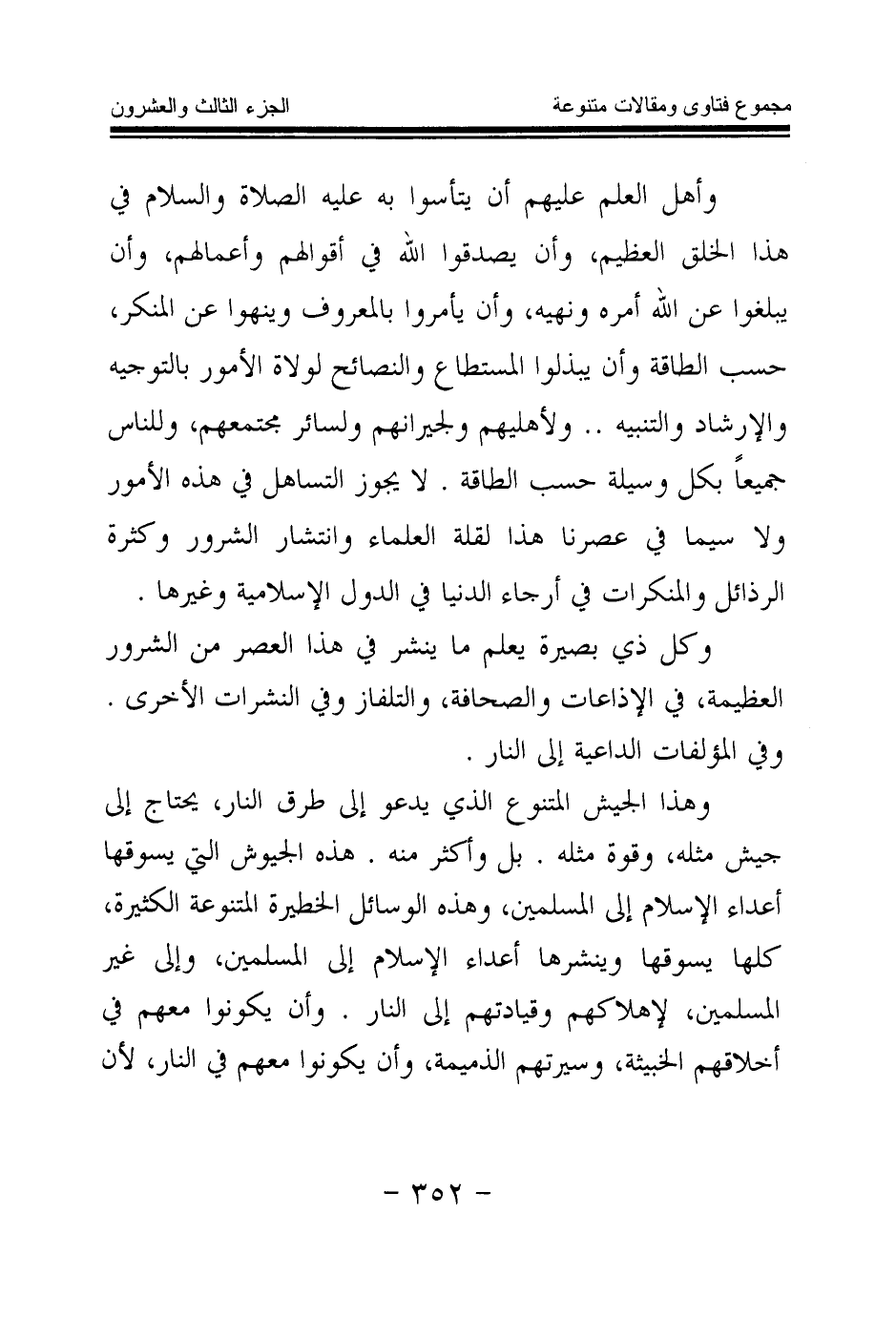 وأهل العلم عليهم أن يتأسوا به عليه الصلاة والسلام في هذا الخلق العظيم، وأن يصدقوا الله في أقوالهم وأعمالهم، وأن يبلغوا عن الله أمره ونهيه، وأن يأمروا بالمعروف وينهوا عن المنكر حسب الطاقة، وأن يبذلوا المستطاع والنصائح لولاة الأمور بالتوجيه والإرشاد والتنبيه. . ولأهليهم ولجيرانهم ولسائر مجتمعهم وللناس جميعا بكل وسيلة حسب الطاقة. لا يجوز التساهل في هذه الأمور ولا سيما في عصرنا هذا لقلة العلماء وانتشار الشرور وكثرة الرذائل والمنكرات في أرجاء الدنيا في الدول الإسلامية وغيرها. وكل ذي بصيرة يعلم ما ينشر في هذا العصر من الشرور العظيمة، في الإذاعات والصحافة، والتلفاز وفي النشرات الأخرى. وفي المؤلفات الداعية إلى النار.