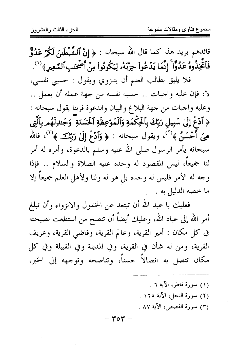 فلا يليق بطالب العلم أن ينزوي ويقول: حسبي نفسي، لا، فإن عليه واجبات. . حسبه نفسه من جهة عمله أن يعمل. . وعليه واجبات من جهة البلاغ والبيان والدعوة فربنا يقول سبحانه: {ادْعُ إِلَى سَبِيلِ رَبِّكَ بِالْحِكْمَةِ وَالْمَوْعِظَةِ الْحَسَنَةِ وَجَادِلْهُمْ بِالَّتِي هِيَ أَحْسَنُ} (¬2) ويقول سبحانه: {وَادْعُ إِلَى رَبِّكَ} (¬3) فالله سبحانه يأمر الرسول صلى الله عليه وسلم بالدعوة، وأمره له أمر لنا جميعا، ليس المقصود له وحده عليه الصلاة والسلام. . فإذا وجه له الأمر فليس له وحده بل هو له ولنا ولأهل العلم جميعا إلا ما خصه الدليل به.