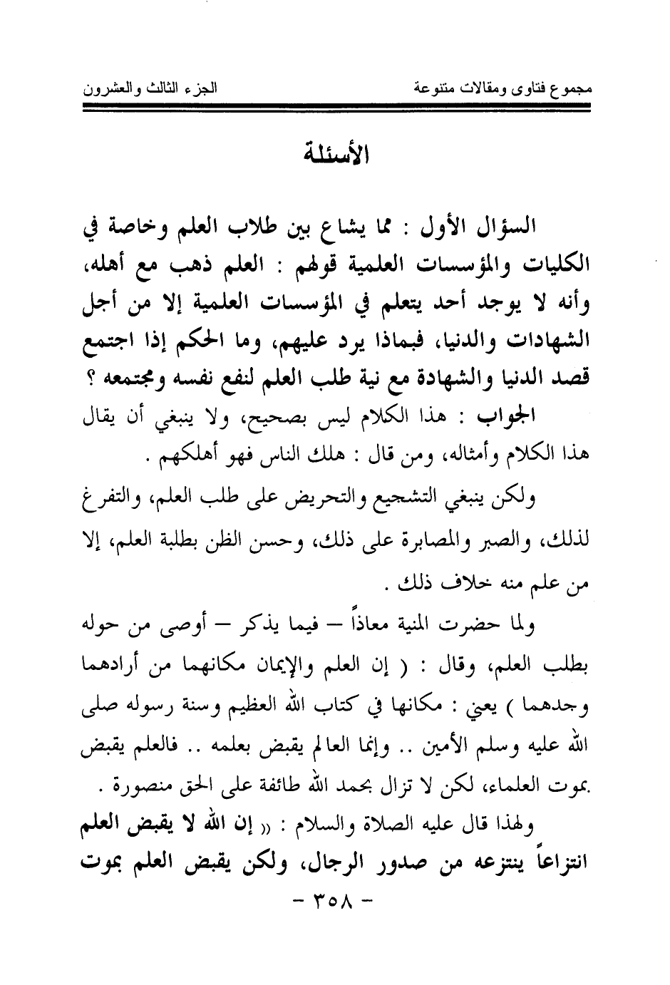 السؤال الأول: مما يشاع بين طلاب العلم وخاصة في الكليات والمؤسسات العلمية قولهم: العلم ذهب مع أهله، وأنه لا يوجد أحد يتعلم في المؤسسات العلمية إلا من أجل الشهادات والدنيا، فبماذا يرد عليهم، وما الحكم إذا اجتمع قصد الدنيا والشهادة مع نية طلب العلم لنفع نفسه ومجتمعه؟
