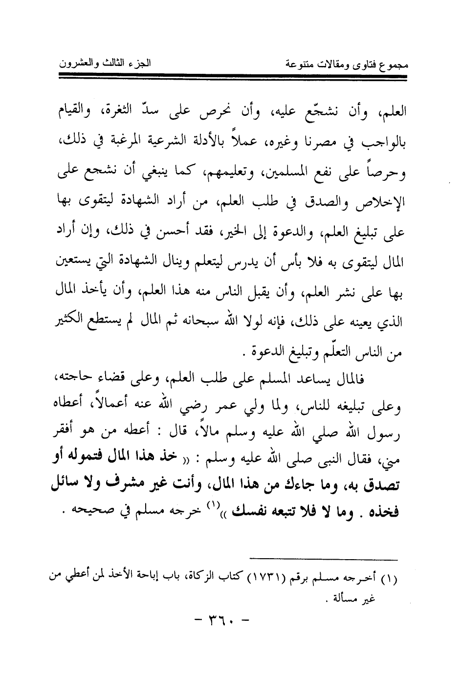 فالمال يساعد المسلم على طلب العلم، وعلى قضاء حاجته، وعلى تبليغه للناس، ولما ولى عمر رضي الله عنه أعمالا، أعطاه رسول الله صلى الله عليه وسلم مالا، قال: أعطه من هو أفقر مني، فقال النبي صلى الله عليه وسلم: «خذ هذا المال فتموله أو تصدق به، وما جاءك من هذا المال، وأنت غير مشرف ولا سائل فخذه. وما لا فلا تتبعه نفسك (¬1) » خرجه مسلم في صحيحه.
