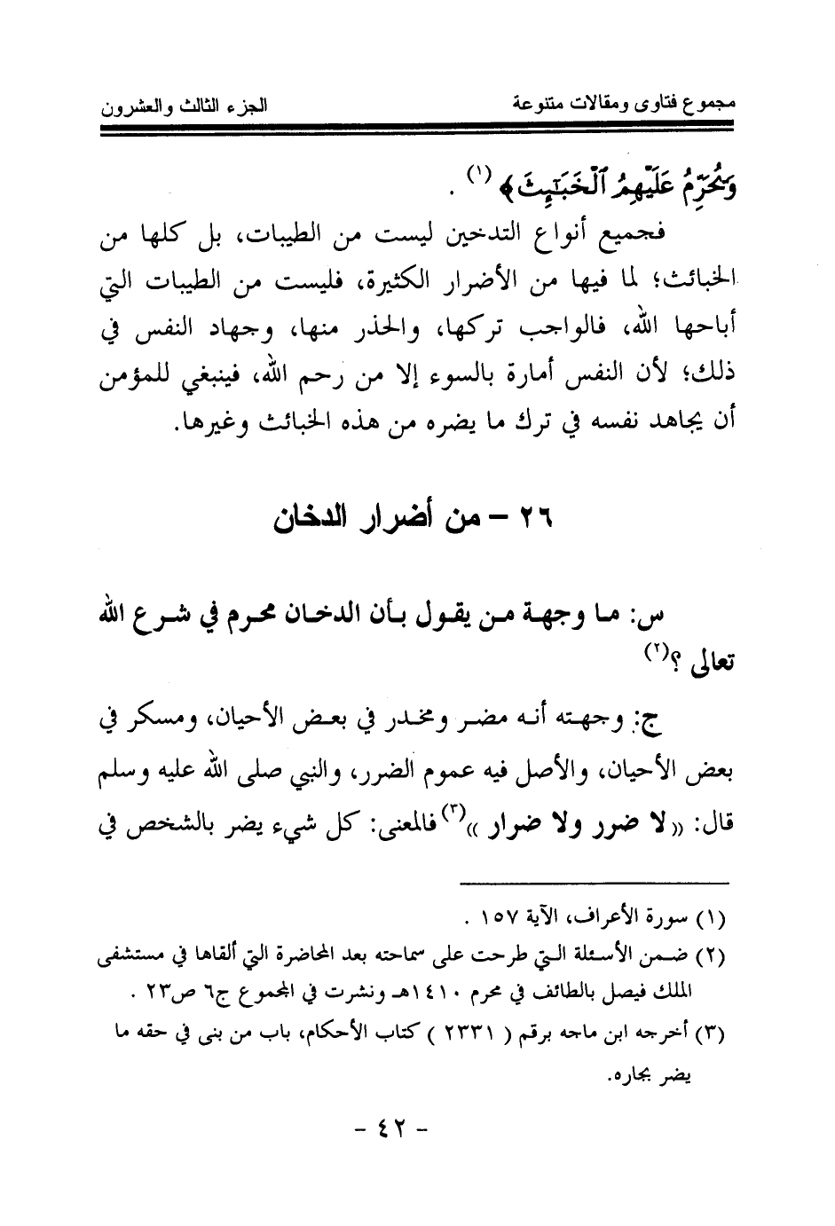 ج: وجهته أنه مضر ومخدر في بعض الأحيان، ومسكر في بعض الأحيان، والأصل فيه عموم الضرر، والنبي صلى الله عليه وسلم قال: «لا ضرر ولا ضرار (¬1) » . فالمعنى: كل شيء يضر بالشخص في