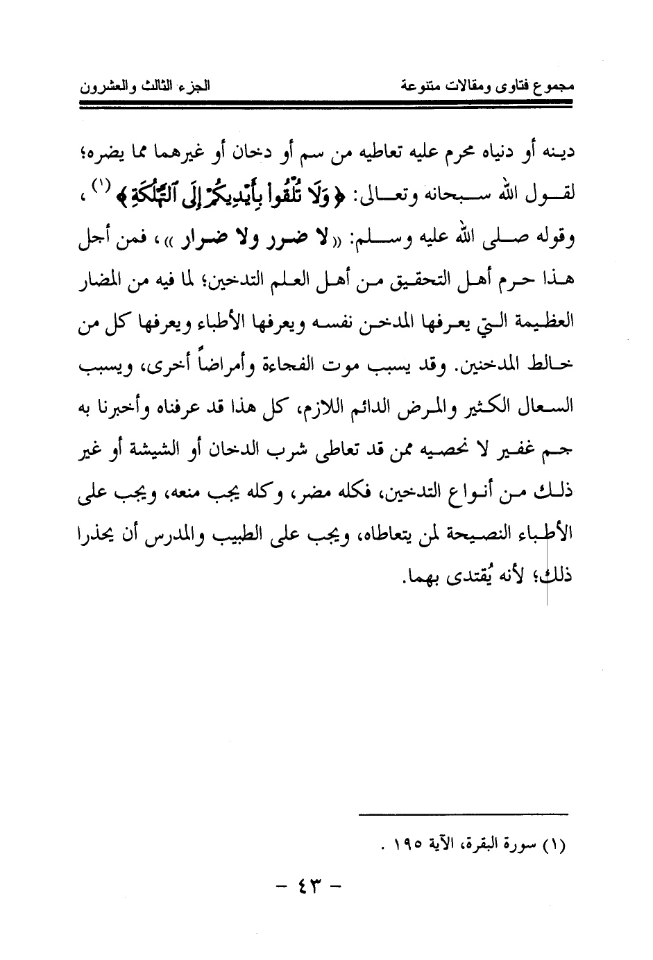 دينه أو دنياه محرم عليه تعاطيه من سم أو دخان أو غيرهما مما يضره؛ لقول الله سبحانه وتعالى: {وَلَا تُلْقُوا بِأَيْدِيكُمْ إِلَى التَّهْلُكَةِ} (¬1) وقوله صلى الله عليه وسلم: «لا ضرر ولا ضرار (¬2) » ، فمن أجل هذا حرم أهل التحقيق من أهل العلم التدخين، لما فيه من المضار العظيمة التي يعرفها المدخن نفسه ويعرفها الأطباء ويعرفها كل من خالط المدخنين. وقد يسبب موت الفجاءة وأمراضا أخرى، ويسبب السعال الكثير والمرض الدائم اللازم، كل هذا قد عرفناه وأخبرنا به جم غفير لا نحصيه ممن قد تعاطى شرب الدخان أو الشيشة أو غير ذلك من أنواع التدخين، فكله مضر، وكله يجب منعه، ويجب على الأطباء النصيحة لمن يتعاطاه، ويجب على الطبيب والمدرس أن يحذرا ذلك؛ لأنه يقتدى بهما.