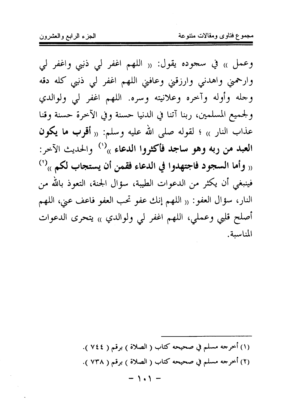 وعمل (¬1) » في سجوده يقول: «اللهم اغفر لي ذنبي واغفر لي وارحمني واهدني وارزقني وعافني اللهم اغفر لي ذنبي كله دقه وجله وأوله وآخره وعلانيته وسره. اللهم اغفر لي ولوالدي ولجميع المسلمين، ربنا آتنا في الدنيا حسنة وفي الآخرة حسنة وقنا عذاب النار (¬2) » ؛ لقوله صلى الله عليه وسلم: «أقرب ما يكون العبد من ربه وهو ساجد فأكثروا الدعاء (¬3) » . والحديث الآخر: «وأما السجود فاجتهدوا في الدعاء فقمن أن يستجاب لكم (¬4) » . فينبغي أن يكثر من الدعوات الطيبة، سؤال الجنة، التعوذ بالله من النار، سؤال العفو: «اللهم إنك عفو تحب العفو فاعف عني، اللهم أصلح قلبي وعملي، اللهم اغفر لي ولوالدي» يتحرى الدعوات المناسبة.