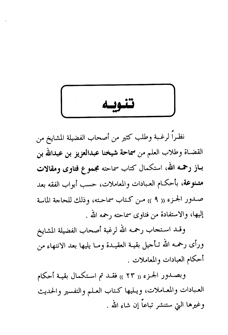 وبصدور الجزء " 23 " فقد تم استكمال بقية أحكام العبادات والمعاملات، ويليها كتاب العلم والتفسير والحديث وغيرها التي ستنشر تباعا إن شاء الله.