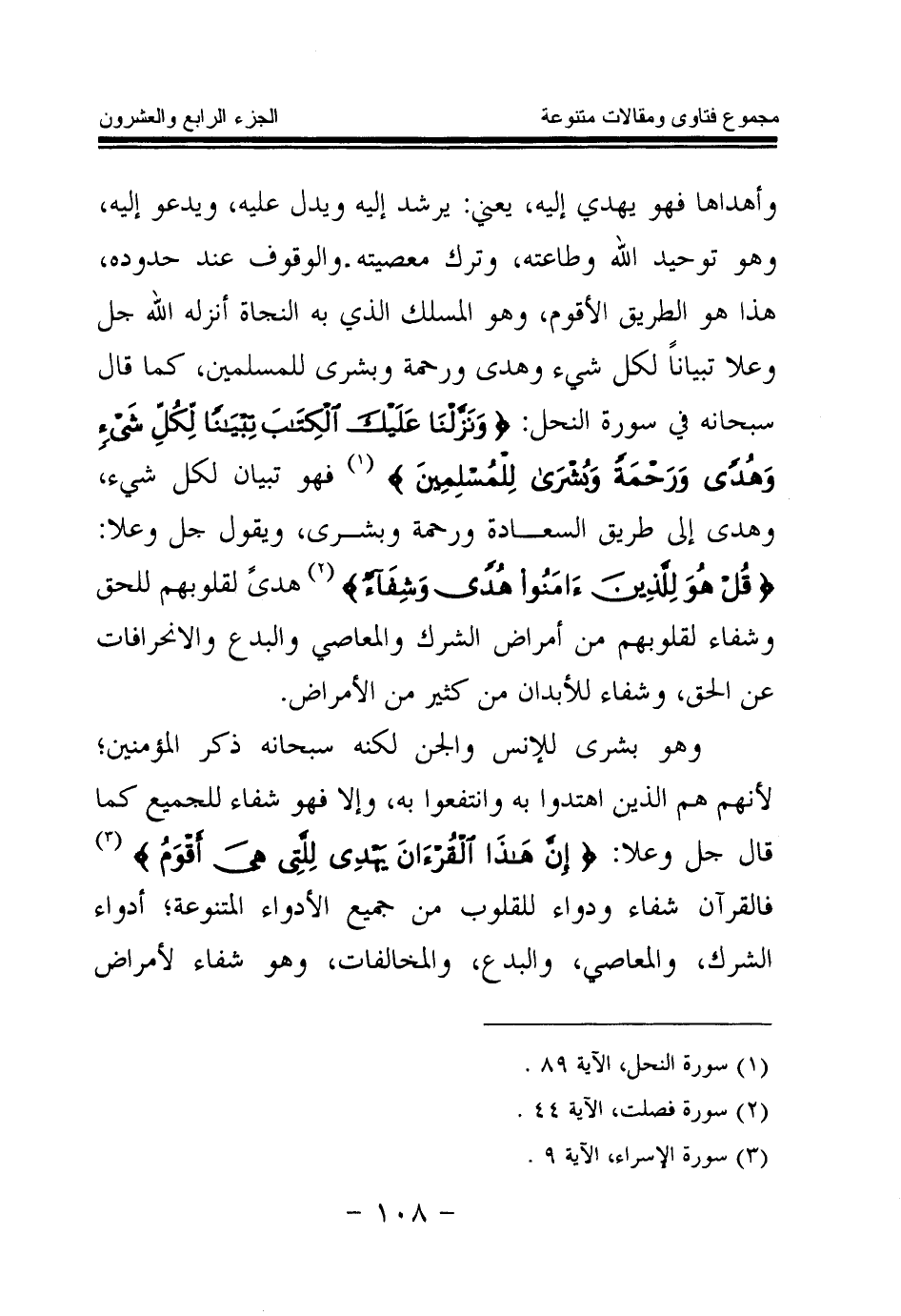 وهو بشرى للإنس والجن لكنه سبحانه ذكر المؤمنين؛ لأنهم هم الذين اهتدوا به وانتفعوا به، وإلا فهو شفاء للجميع كما قال جل وعلا: {إِنَّ هَذَا الْقُرْآنَ يَهْدِي لِلَّتِي هِيَ أَقْوَمُ} (¬3) فالقرآن شفاء ودواء للقلوب من جميع الأدواء المتنوعة؛ أدواء الشرك، والمعاصي، والبدع، والمخالفات، وهو شفاء لأمراض