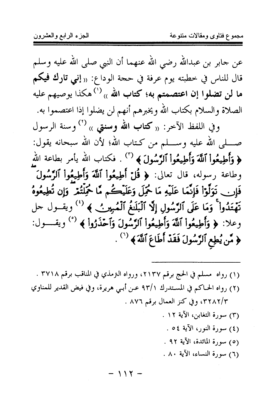 عن جابر بن عبد الله رضي الله عنهما أن النبي صلى الله عليه وسلم قال للناس في خطبته يوم عرفة في حجة الوداع: «إني تارك فيكم ما لن تضلوا إن اعتصمتم به؛ كتاب الله (¬1) » . هكذا يوصيهم عليه الصلاة والسلام بكتاب الله ويخبرهم أنهم لن يضلوا إذا اعتصموا به. وفي اللفظ الآخر: «كتاب الله وسنتي (¬2) » . وسنة الرسول صلى الله عليه وسلم من كتاب الله؛ لأن الله سبحانه يقول: {وَأَطِيعُوا اللَّهَ وَأَطِيعُوا الرَّسُولَ} (¬3) فكتاب الله يأمر بطاعة الله وطاعة رسوله، قال تعالى: {قُلْ أَطِيعُوا اللَّهَ وَأَطِيعُوا الرَّسُولَ فَإِنْ تَوَلَّوْا فَإِنَّمَا عَلَيْهِ مَا حُمِّلَ وَعَلَيْكُمْ مَا حُمِّلْتُمْ وَإِنْ تُطِيعُوهُ تَهْتَدُوا وَمَا عَلَى الرَّسُولِ إِلَّا الْبَلَاغُ الْمُبِينُ} (¬4) ويقول جل وعلا: {وَأَطِيعُوا اللَّهَ وَأَطِيعُوا الرَّسُولَ وَاحْذَرُوا} (¬5) ويقول: {مَنْ يُطِعِ الرَّسُولَ فَقَدْ أَطَاعَ اللَّهَ} (¬6)
