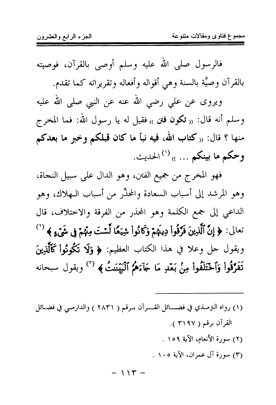 فهو المخرج من جميع الفتن، وهو الدال على سبيل النجاة، وهو المرشد إلى أسباب السعادة والمحذر من أسباب الهلاك، وهو الداعي إلى جمع الكلمة وهو المحذر من الفرقة والاختلاف، قال تعالى: {إِنَّ الَّذِينَ فَرَّقُوا دِينَهُمْ وَكَانُوا شِيَعًا لَسْتَ مِنْهُمْ فِي شَيْءٍ} (¬2) ويقول جل وعلا في هذا الكتاب العظيم: {وَلَا تَكُونُوا كَالَّذِينَ تَفَرَّقُوا وَاخْتَلَفُوا مِنْ بَعْدِ مَا جَاءَهُمُ الْبَيِّنَاتُ} (¬3) ويقول سبحانه