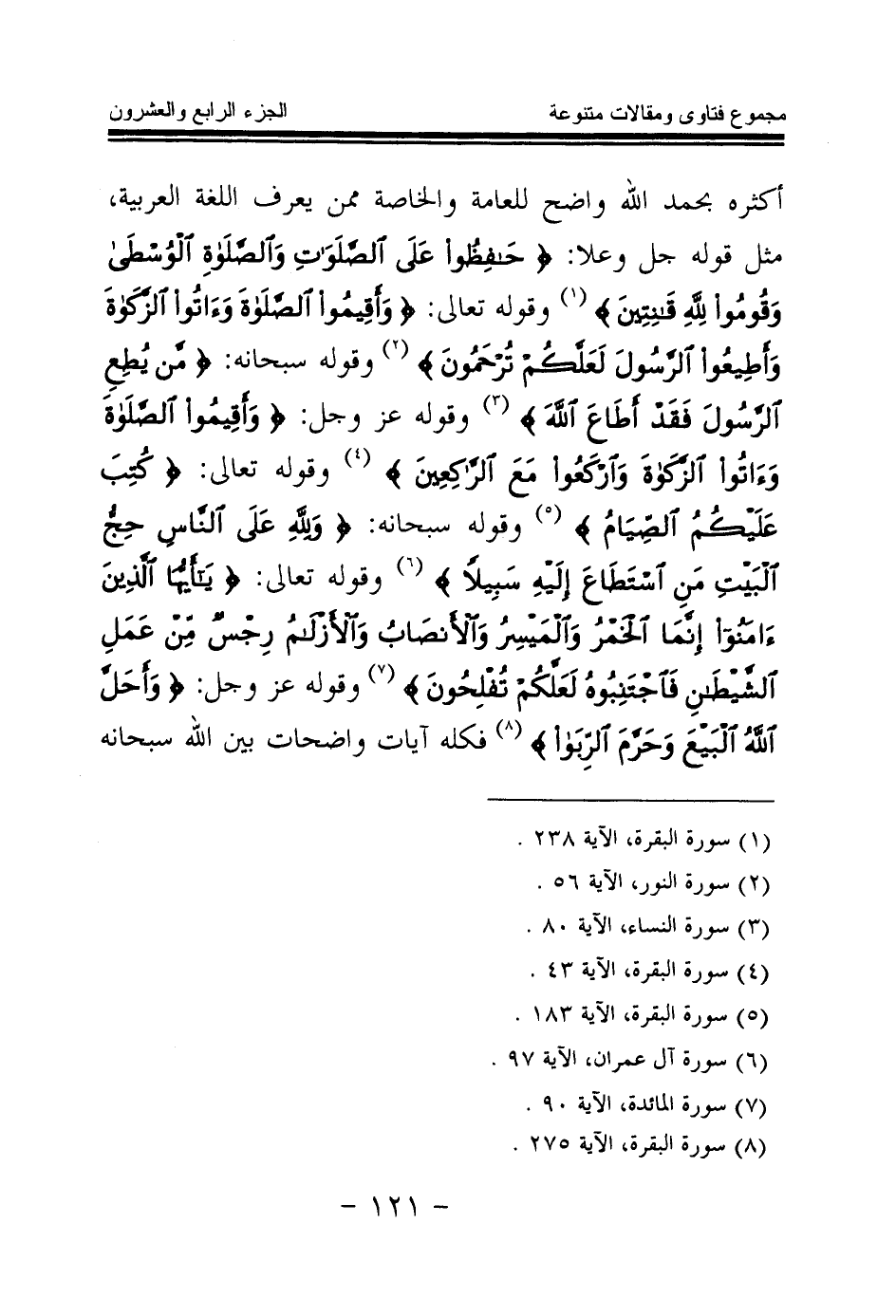 أكثره بحمد الله واضح للعامة والخاصة ممن يعرف اللغة العربية، مثل قوله جل وعلا: {حَافِظُوا عَلَى الصَّلَوَاتِ وَالصَّلَاةِ الْوُسْطَى وَقُومُوا لِلَّهِ قَانِتِينَ} (¬1) وقوله تعالى: {وَأَقِيمُوا الصَّلَاةَ وَآتُوا الزَّكَاةَ وَأَطِيعُوا الرَّسُولَ لَعَلَّكُمْ تُرْحَمُونَ} (¬2) وقوله سبحانه: {مَنْ يُطِعِ الرَّسُولَ فَقَدْ أَطَاعَ اللَّهَ} (¬3) وقوله عز وجل: {وَأَقِيمُوا الصَّلَاةَ وَآتُوا الزَّكَاةَ وَارْكَعُوا مَعَ الرَّاكِعِينَ} (¬4) وقوله تعالى: {كُتِبَ عَلَيْكُمُ الصِّيَامُ} (¬5) وقوله سبحانه: {وَلِلَّهِ عَلَى النَّاسِ حِجُّ الْبَيْتِ مَنِ اسْتَطَاعَ إِلَيْهِ سَبِيلًا} (¬6) وقوله تعالى: {يَا أَيُّهَا الَّذِينَ آمَنُوا إِنَّمَا الْخَمْرُ وَالْمَيْسِرُ وَالْأَنْصَابُ وَالْأَزْلَامُ رِجْسٌ مِنْ عَمَلِ الشَّيْطَانِ فَاجْتَنِبُوهُ لَعَلَّكُمْ تُفْلِحُونَ} (¬7) وقوله عز وجل: {وَأَحَلَّ اللَّهُ الْبَيْعَ وَحَرَّمَ الرِّبَا} (¬8) فكله آيات واضحات بين الله سبحانه