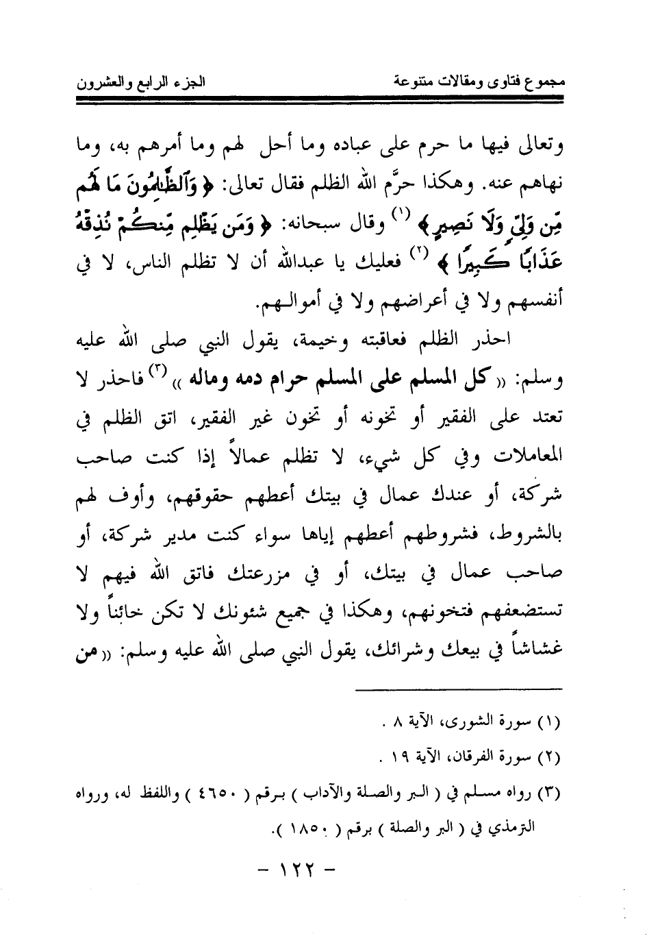 وتعالى فيها ما حرم على عباده وما أحل لهم وما أمرهم به، وما نهاهم عنه. وهكذا حرم الله الظلم فقال تعالى: {وَالظَّالِمُونَ مَا لَهُمْ مِنْ وَلِيٍّ وَلَا نَصِيرٍ} (¬1) وقال سبحانه: {وَمَنْ يَظْلِمْ مِنْكُمْ نُذِقْهُ عَذَابًا كَبِيرًا} (¬2) فعليك يا عبد الله أن لا تظلم الناس، لا في أنفسهم ولا في أعراضهم ولا في أموالهم.