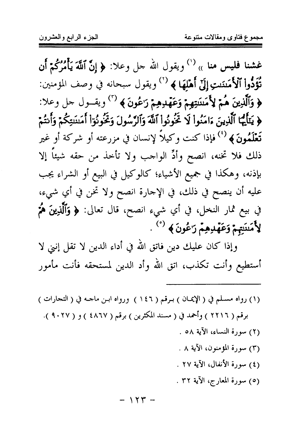 غشنا فليس منا (¬1) » ، ويقول الله جل وعلا: {إِنَّ اللَّهَ يَأْمُرُكُمْ أَنْ تُؤَدُّوا الْأَمَانَاتِ إِلَى أَهْلِهَا} (¬2) ويقول سبحانه في وصف المؤمنين: {وَالَّذِينَ هُمْ لِأَمَانَاتِهِمْ وَعَهْدِهِمْ رَاعُونَ} (¬3) ويقول جل وعلا: {يَا أَيُّهَا الَّذِينَ آمَنُوا لَا تَخُونُوا اللَّهَ وَالرَّسُولَ وَتَخُونُوا أَمَانَاتِكُمْ وَأَنْتُمْ تَعْلَمُونَ} (¬4) فإذا كنت وكيلا لإنسان في مزرعته أو شركة أو غير ذلك فلا تخنه، انصح وأد الواجب ولا تأخذ من حقه شيئا إلا بإذنه، وهكذا في جميع الأشياء؛ كالوكيل في البيع أو الشراء يجب عليه أن ينصح في ذلك، في الإجارة انصح ولا تخن في أي شيء، في بيع ثمار النخل، في أي شيء انصح، قال تعالى: {وَالَّذِينَ هُمْ لِأَمَانَاتِهِمْ وَعَهْدِهِمْ رَاعُونَ} (¬5)