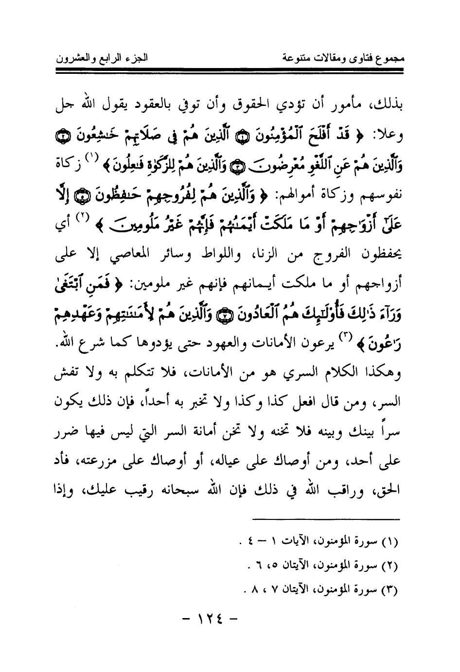 بذلك، مأمور أن تؤدي الحقوق وأن توفي بالعقود يقول الله جل وعلا: {قَدْ أَفْلَحَ الْمُؤْمِنُونَ} (¬1) {الَّذِينَ هُمْ فِي صَلَاتِهِمْ خَاشِعُونَ} (¬2) {وَالَّذِينَ هُمْ عَنِ اللَّغْوِ مُعْرِضُونَ} (¬3) {وَالَّذِينَ هُمْ لِلزَّكَاةِ فَاعِلُونَ} (¬4) زكاة نفوسهم وزكاة أموالهم: {وَالَّذِينَ هُمْ لِفُرُوجِهِمْ حَافِظُونَ} (¬5) {إِلَّا عَلَى أَزْوَاجِهِمْ أوْ مَا مَلَكَتْ أَيْمَانُهُمْ فَإِنَّهُمْ غَيْرُ مَلُومِينَ} (¬6) أي: يحفظون الفروج من الزنا، واللواط وسائر المعاصي إلا على أزواجهم أو ما ملكت أيمانهم فإنهم غير ملومين: {فَمَنِ ابْتَغَى وَرَاءَ ذَلِكَ فَأُولَئِكَ هُمُ الْعَادُونَ} (¬7) {وَالَّذِينَ هُمْ لِأَمَانَاتِهِمْ وَعَهْدِهِمْ رَاعُونَ} (¬8) يرعون الأمانات والعهود حتى يؤدوها كما شرع الله. وهكذا الكلام السري هو من الأمانات، فلا تتكلم به ولا تفش السر، ومن قال افعل كذا وكذا ولا تخبر به أحدا، فإن ذلك يكون سرا بينك وبينه فلا تخنه ولا تخن أمانة السر التي ليس فيها ضرر على أحد، ومن أوصاك على عياله، أو أوصاك على مزرعته، فأد الحق، وراقب الله في ذلك فإن الله سبحانه رقيب عليك، وإذا