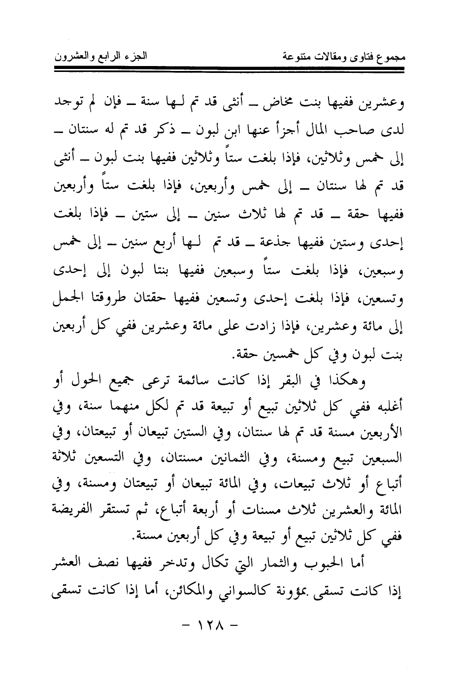 وعشرين ففيها بنت مخاض- أنثى قد تم لها سنة- فإن لم توجد لدى صاحب المال أجزأ عنها ابن لبون- ذكر قد تم له سنتان- إلى خمس وثلاثين، فإذا بلغت ستا وثلاثين ففيها بنت لبون- أنثى قد تم لها سنتان- إلى خمس وأربعين، فإذا بلغت ستا وأربعين ففيها حقة - قد تم لها ثلاث سنين- إلى ستين- فإذا بلغت إحدى وستين ففيها جذعة - قد تم لها أربع سنين- إلى خمس وسبعين، فإذا بلغت ستا وسبعين ففيها بنتا لبون إلى إحدى وتسعين، فإذا بلغت إحدى وتسعين ففيها حقتان طروقتا الجمل إلى مائة وعشرين، فإذا زادت على مائة وعشرين ففي كل أربعين بنت لبون وفي كل خمسين حقة.