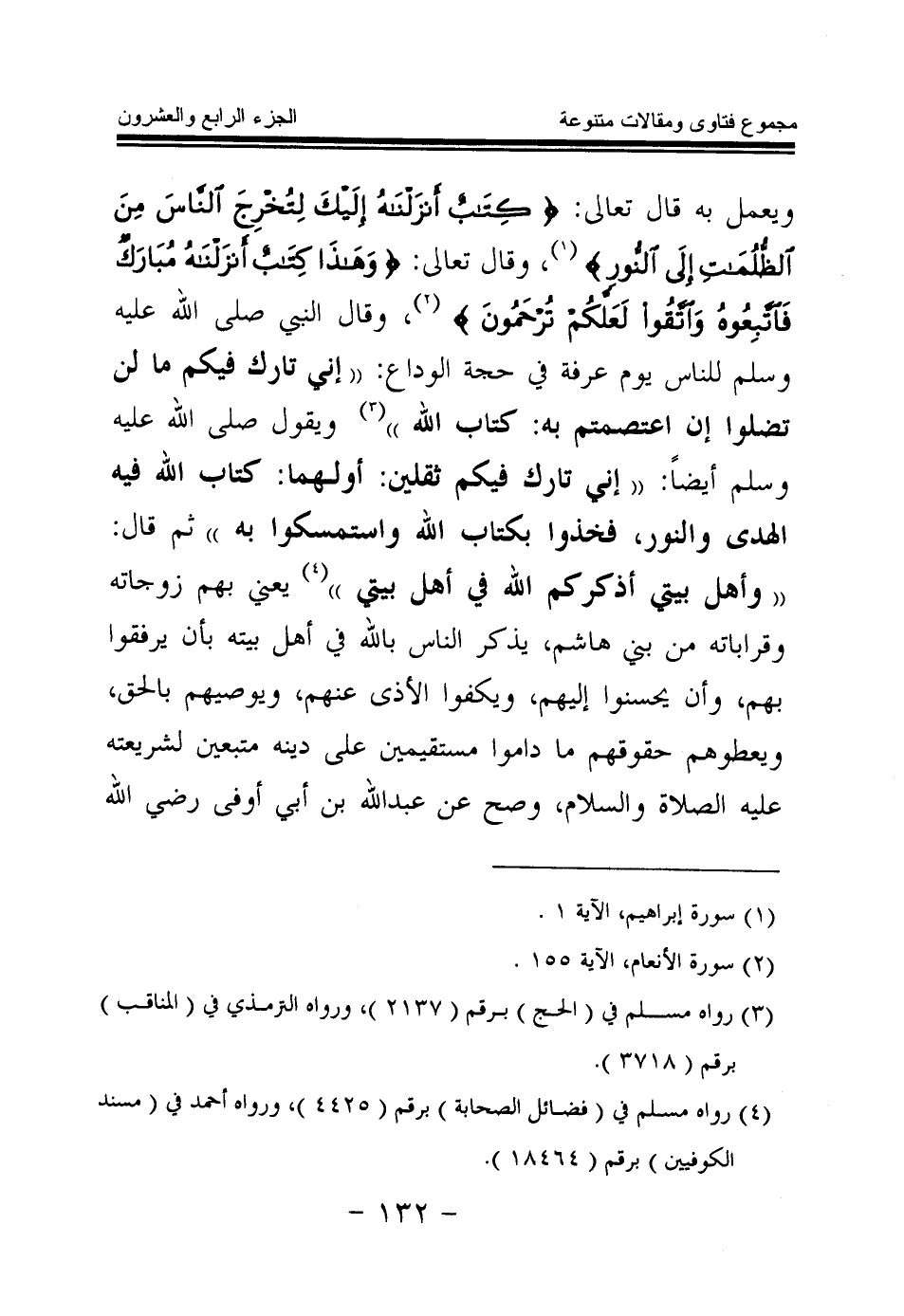 ويعمل به قال تعالى: {كِتَابٌ أَنْزَلْنَاهُ إِلَيْكَ لِتُخْرِجَ النَّاسَ مِنَ الظُّلُمَاتِ إِلَى النُّورِ} (¬1) وقال تعالى: {وَهَذَا كِتَابٌ أَنْزَلْنَاهُ مُبَارَكٌ فَاتَّبِعُوهُ وَاتَّقُوا لَعَلَّكُمْ تُرْحَمُونَ} (¬2) وقال النبي صلى الله عليه وسلم للناس يوم عرفة في حجة الوداع: «إني تارك فيكم ما لن تضلوا إن اعتصمتم به: كتاب الله (¬3) » . ويقول صلى الله عليه وسلم أيضا: «إني تارك فيكم ثقلين: أولهما: كتاب الله فيه الهدى والنور، فخذوا بكتاب الله واستمسكوا به، ثم قال: وأهل بيتي أذكركم الله في أهل بيتي (¬4) » . يعني بهم زوجاته وقراباته من بني هاشم، يذكر الناس بالله في أهل بيته بأن يرفقوا بهم، وأن يحسنوا إليهم، ويكفوا الأذى عنهم، ويوصيهم بالحق، ويعطوهم حقوقهم ما داموا مستقيمين على دينه متبعين لشريعته عليه الصلاة والسلام، وصح «عن عبد الله بن أبي أوفى رضي الله