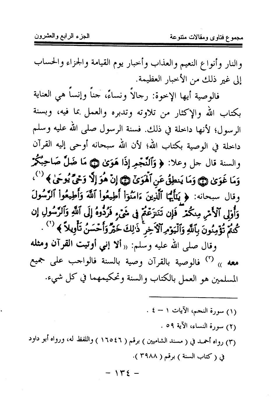 فالوصية أيها الإخوة: رجالا ونساء، جنا وإنسا هي العناية بكتاب الله والإكثار من تلاوته وتدبره والعمل بما فيه، وبسنة الرسول؛ لأنها داخلة في ذلك. فسنة الرسول صلى الله عليه وسلم داخلة في الوصية بكتاب الله؛ لأن الله سبحانه أوحى إليه القرآن والسنة قال جل وعلا: {وَالنَّجْمِ إِذَا هَوَى} (¬1) {مَا ضَلَّ صَاحِبُكُمْ وَمَا غَوَى} (¬2) {وَمَا يَنْطِقُ عَنِ الْهَوَى} (¬3) {إِنْ هُوَ إِلَّا وَحْيٌ يُوحَى} (¬4) وقال سبحانه: {يَا أَيُّهَا الَّذِينَ آمَنُوا أَطِيعُوا اللَّهَ وَأَطِيعُوا الرَّسُولَ وَأُولِي الْأَمْرِ مِنْكُمْ فَإِنْ تَنَازَعْتُمْ فِي شَيْءٍ فَرُدُّوهُ إِلَى اللَّهِ وَالرَّسُولِ إِنْ كُنْتُمْ تُؤْمِنُونَ بِاللَّهِ وَالْيَوْمِ الْآخِرِ ذَلِكَ خَيْرٌ وَأَحْسَنُ تَأْوِيلًا} (¬5) وقال صلى الله عليه وسلم: «ألا إني أوتيت القرآن ومثله معه (¬6) » .