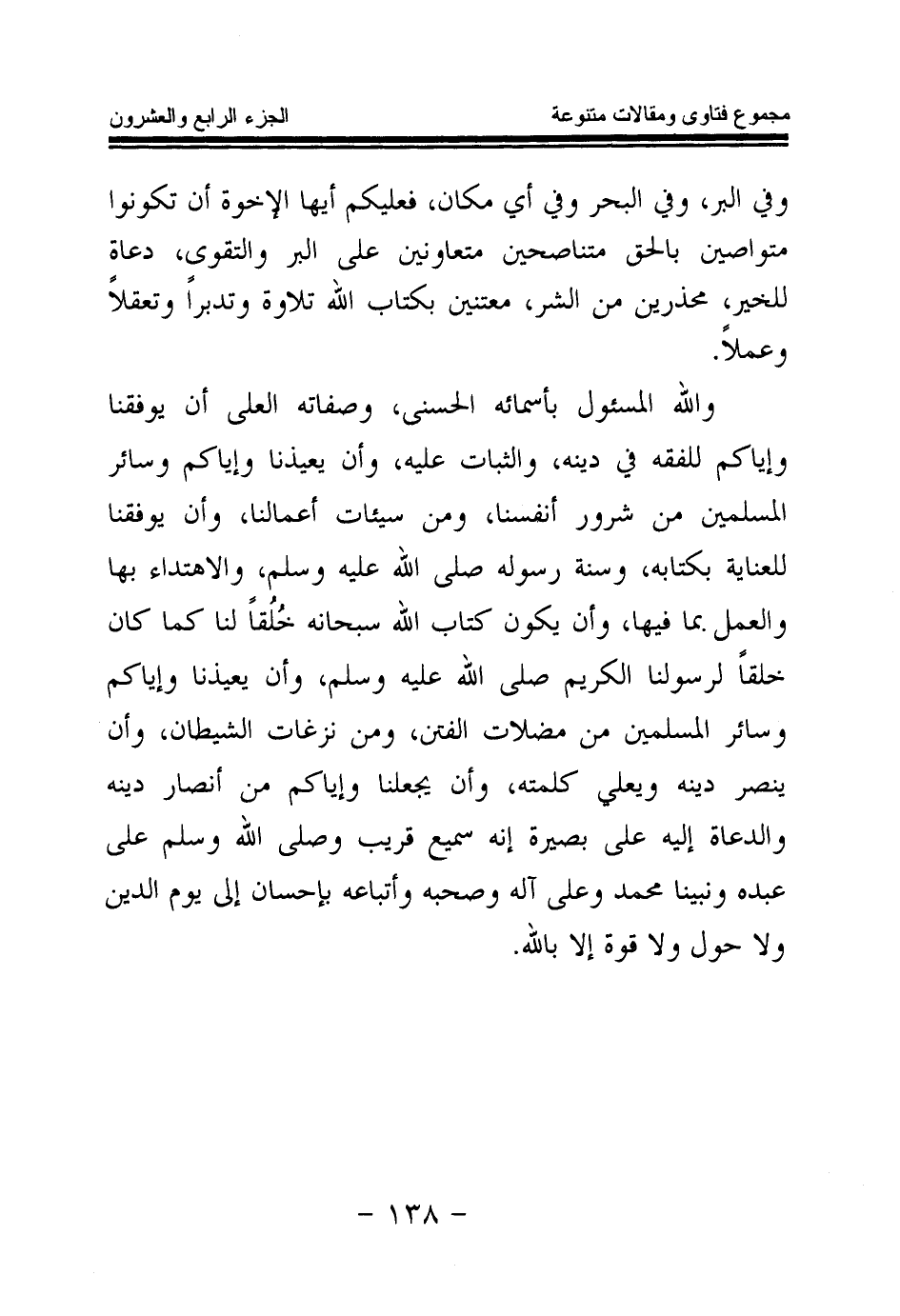 والله المسئول بأسمائه الحسنى، وصفاته العلا أن يوفقنا وإياكم للفقه في دينه، والثبات عليه، وأن يعيذنا وإياكم وسائر المسلمين من شرور أنفسنا، ومن سيئات أعمالنا، وأن يوفقنا للعناية بكتابه، وسنة رسوله صلى الله عليه وسلم، والاهتداء بها والعمل بما فيها، وأن يكون كتاب الله سبحانه خلقا لنا كما كان خلقا لرسولنا الكريم صلى الله عليه وسلم، وأن يعيذنا وإياكم وسائر المسلمين من مضلات الفتن، ومن نزغات الشيطان، وأن ينصر دينه ويعلي كلمته، وأن يجعلنا وإياكم من أنصار دينه والدعاة إليه على بصيرة إنه سميع قريب وصلى الله وسلم على عبده ونبينا محمد وعلى آله وصحبه وأتباعه بإحسان إلى يوم الدين ولا حول ولا قوة إلا بالله.