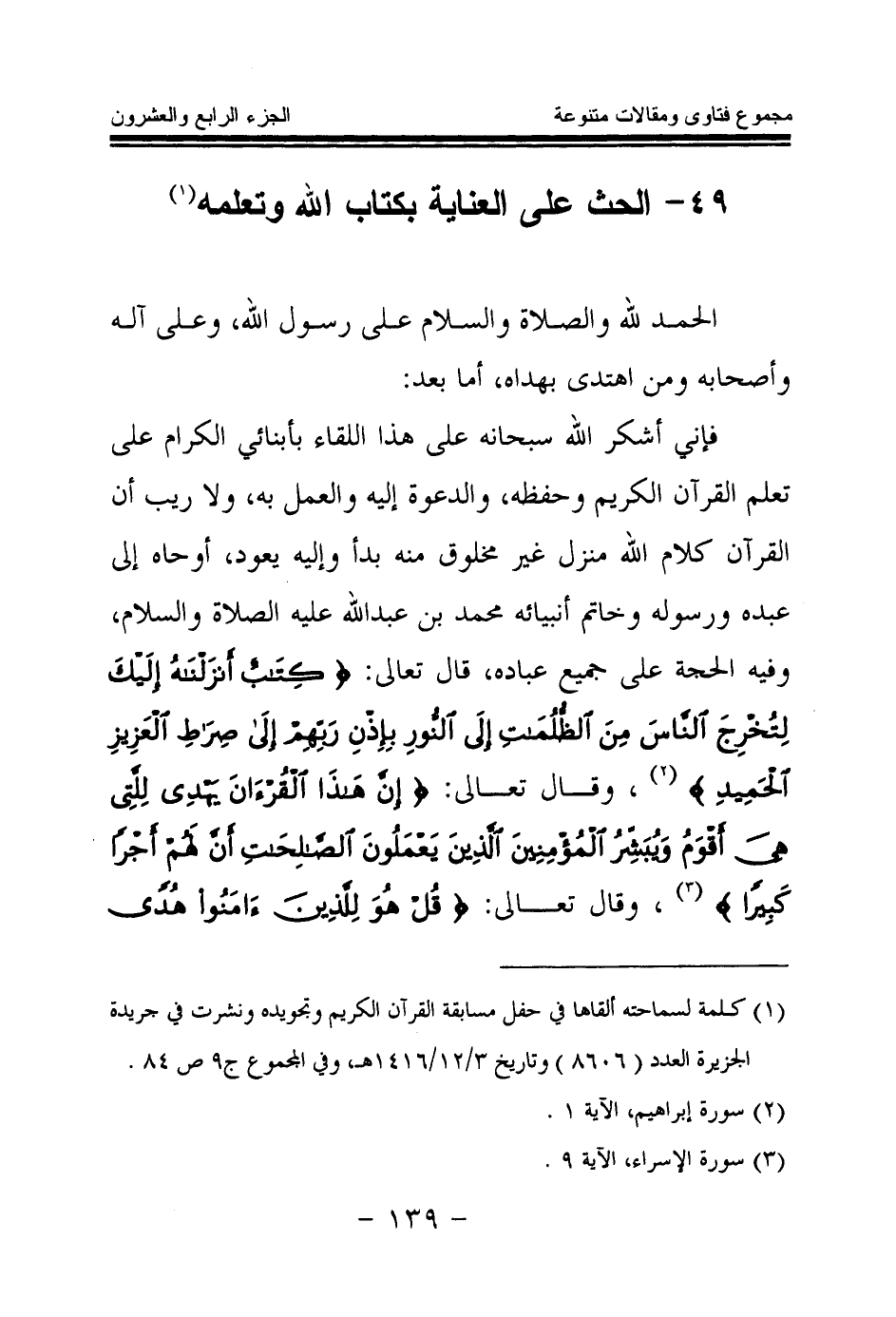 فإني أشكر الله سبحانه على هذا اللقاء بأبنائي الكرام على تعلم القرآن الكريم وحفظه، والدعوة إليه والعمل به، ولا ريب أن القرآن كلام الله منزل غير مخلوق، منه بدأ وإليه يعود، أوحاه إلى عبده ورسوله وخاتم أنبيائه محمد بن عبد الله عليه الصلاة والسلام، وفيه الحجة على جميع عباده. قال تعالى: {كِتَابٌ أَنْزَلْنَاهُ إِلَيْكَ لِتُخْرِجَ النَّاسَ مِنَ الظُّلُمَاتِ إِلَى النُّورِ بِإِذْنِ رَبِّهِمْ إِلَى صِرَاطِ الْعَزِيزِ الْحَمِيدِ} (¬1) وقال تعالى: {إِنَّ هَذَا الْقُرْآنَ يَهْدِي لِلَّتِي هِيَ أَقْوَمُ وَيُبَشِّرُ الْمُؤْمِنِينَ الَّذِينَ يَعْمَلُونَ الصَّالِحَاتِ أَنَّ لَهُمْ أَجْرًا كَبِيرًا} (¬2) وقال تعالى: {قُلْ هُوَ لِلَّذِينَ آمَنُوا هُدًى وَشِفَاءٌ} (¬3)