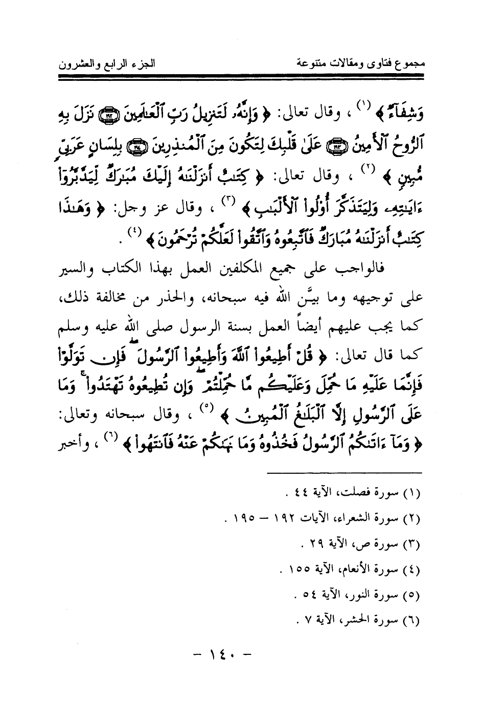 وقال تعالى: {وَإِنَّهُ لَتَنْزِيلُ رَبِّ الْعَالَمِينَ} (¬1) {نَزَلَ بِهِ الرُّوحُ الْأَمِينُ} (¬2) {عَلَى قَلْبِكَ لِتَكُونَ مِنَ الْمُنْذِرِينَ} (¬3) {بِلِسَانٍ عَرَبِيٍّ مُبِينٍ} (¬4) وقال تعالى: {كِتَابٌ أَنْزَلْنَاهُ إِلَيْكَ مُبَارَكٌ لِيَدَّبَّرُوا آيَاتِهِ وَلِيَتَذَكَّرَ أُولُو الْأَلْبَابِ} (¬5) وقال عز وجل: {وَهَذَا كِتَابٌ أَنْزَلْنَاهُ مُبَارَكٌ فَاتَّبِعُوهُ وَاتَّقُوا لَعَلَّكُمْ تُرْحَمُونَ} (¬6)