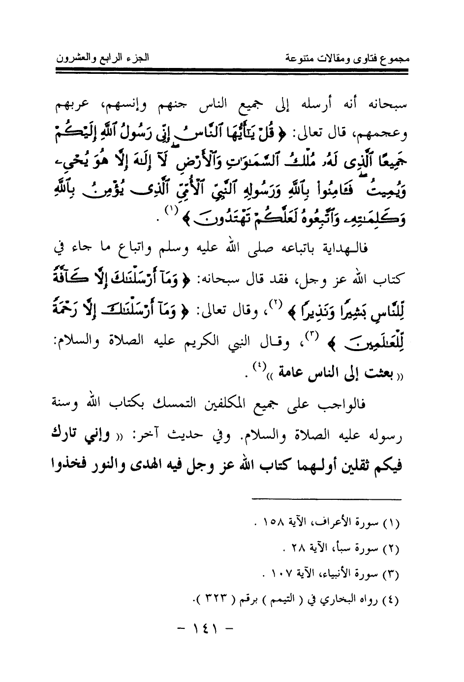 فالهداية باتباعه صلى الله عليه وسلم واتباع ما جاء في كتاب الله عز وجل، فقد قال سبحانه: {وَمَا أَرْسَلْنَاكَ إِلَّا كَافَّةً لِلنَّاسِ بَشِيرًا وَنَذِيرًا} (¬2) وقال تعالى: {وَمَا أَرْسَلْنَاكَ إِلَّا رَحْمَةً لِلْعَالَمِينَ} (¬3) وقال النبي الكريم عليه الصلاة والسلام: «بعثت إلى الناس عامة (¬4) » .
