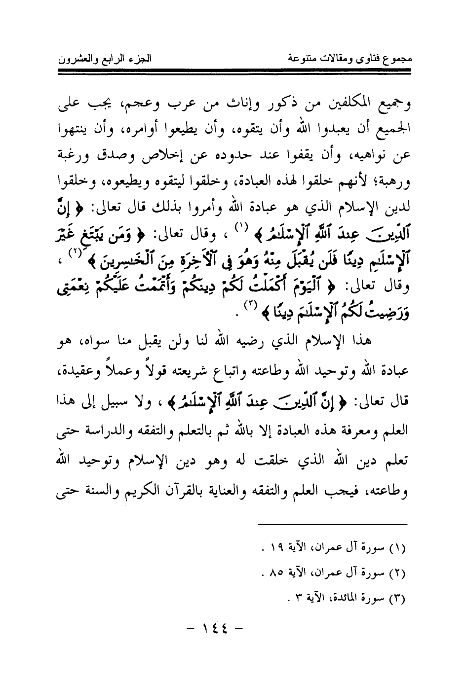 هذا الإسلام الذي رضيه الله لنا ولن يقبل منا سواه، هو عبادة الله وتوحيد الله وطاعته واتباع شريعته قولا وعملا وعقيدة. قال تعالى: {إِنَّ الدِّينَ عِنْدَ اللَّهِ الْإِسْلَامُ} (¬4) ولا سبيل إلى هذا العلم ومعرفة هذه العبادة إلا بالله ثم بالتعلم والتفقه والدراسة حتى تعلم دين الله الذي خلقت له، وهو دين الإسلام وتوحيد الله وطاعته، فيجب التعلم والتفقه والعناية بالقرآن الكريم والسنة حتى