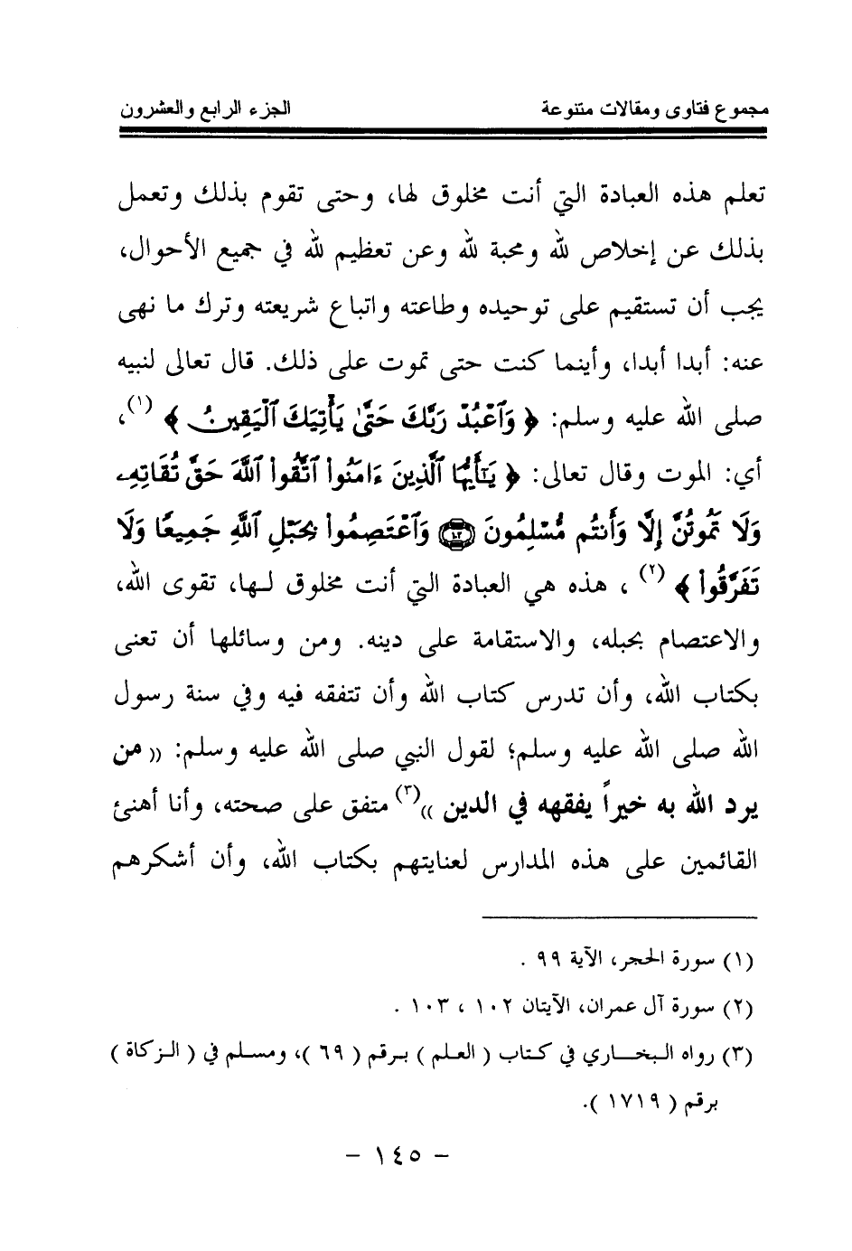 تعلم هذه العبادة التي أنت مخلوق لها، وحتى تقوم بذلك وتعمل بذلك عن إخلاص لله ومحبة لله وعن تعظيم لله في جميع الأحوال، يجب أن تستقيم على توحيده وطاعته واتباع شريعته وترك ما نهى عنه: أبدا أبدا، وأينما كنت حتى تموت على ذلك. قال تعالى لنبيه صلى الله عليه وسلم: {وَاعْبُدْ رَبَّكَ حَتَّى يَأْتِيَكَ الْيَقِينُ} (¬1) أي الموت، وقال تعالى: {يَا أَيُّهَا الَّذِينَ آمَنُوا اتَّقُوا اللَّهَ حَقَّ تُقَاتِهِ وَلَا تَمُوتُنَّ إِلَّا وَأَنْتُمْ مُسْلِمُونَ} (¬2) {وَاعْتَصِمُوا بِحَبْلِ اللَّهِ جَمِيعًا وَلَا تَفَرَّقُوا} (¬3) هذه هي العبادة التي أنت مخلوق لها، تقوى الله، والاعتصام بحبله، والاستقامة على دينه. ومن وسائلها أن تعنى بكتاب الله، وأن تدرس كتاب الله وأن تتفقه فيه وفي سنة رسول الله صلى الله عليه وسلم؛ لقول النبي صلى الله عليه وسلم: «من يرد الله به خيرا يفقهه في الدين (¬4) » متفق على صحته، وأنا أهنئ القائمين على هذه المدارس لعنايتهم بكتاب الله، وأن أشكرهم