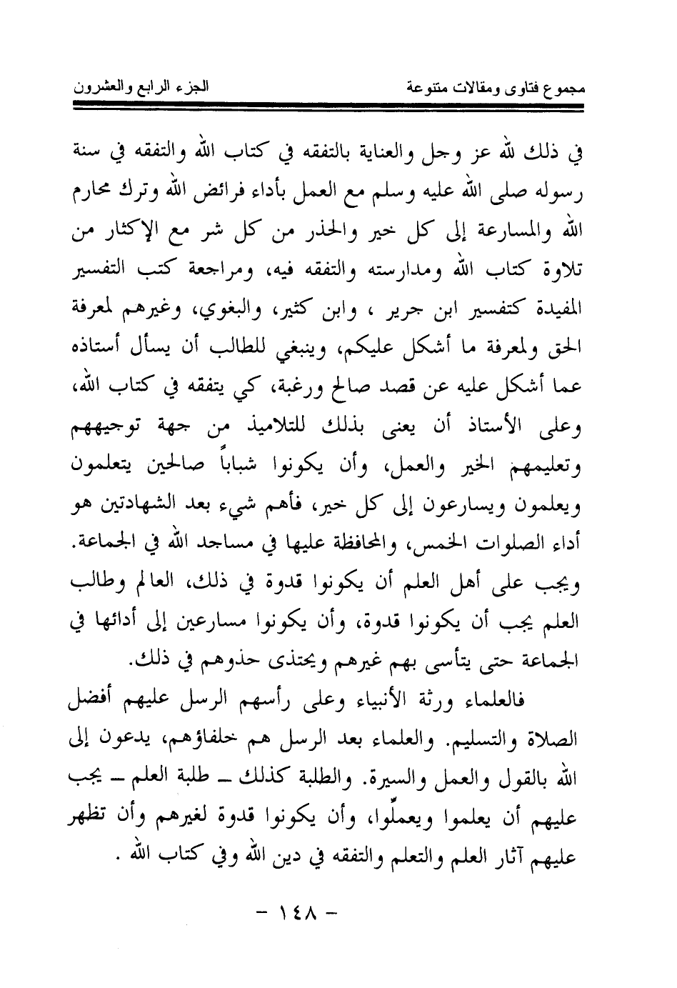 فالعلماء ورثة الأنبياء وعلى رأسهم الرسل عليهم أفضل الصلاة والتسليم. والعلماء بعد الرسل هم خلفاؤهم، يدعون إلى الله بالقول والعمل والسيرة. والطلبة كذلك - طلبة العلم - يجب عليهم أن يعلموا ويعلموا، وأن يكونوا قدوة لغيرهم وأن تظهر عليهم آثار العلم والتعلم والتفقه في دين الله وفي كتاب الله.