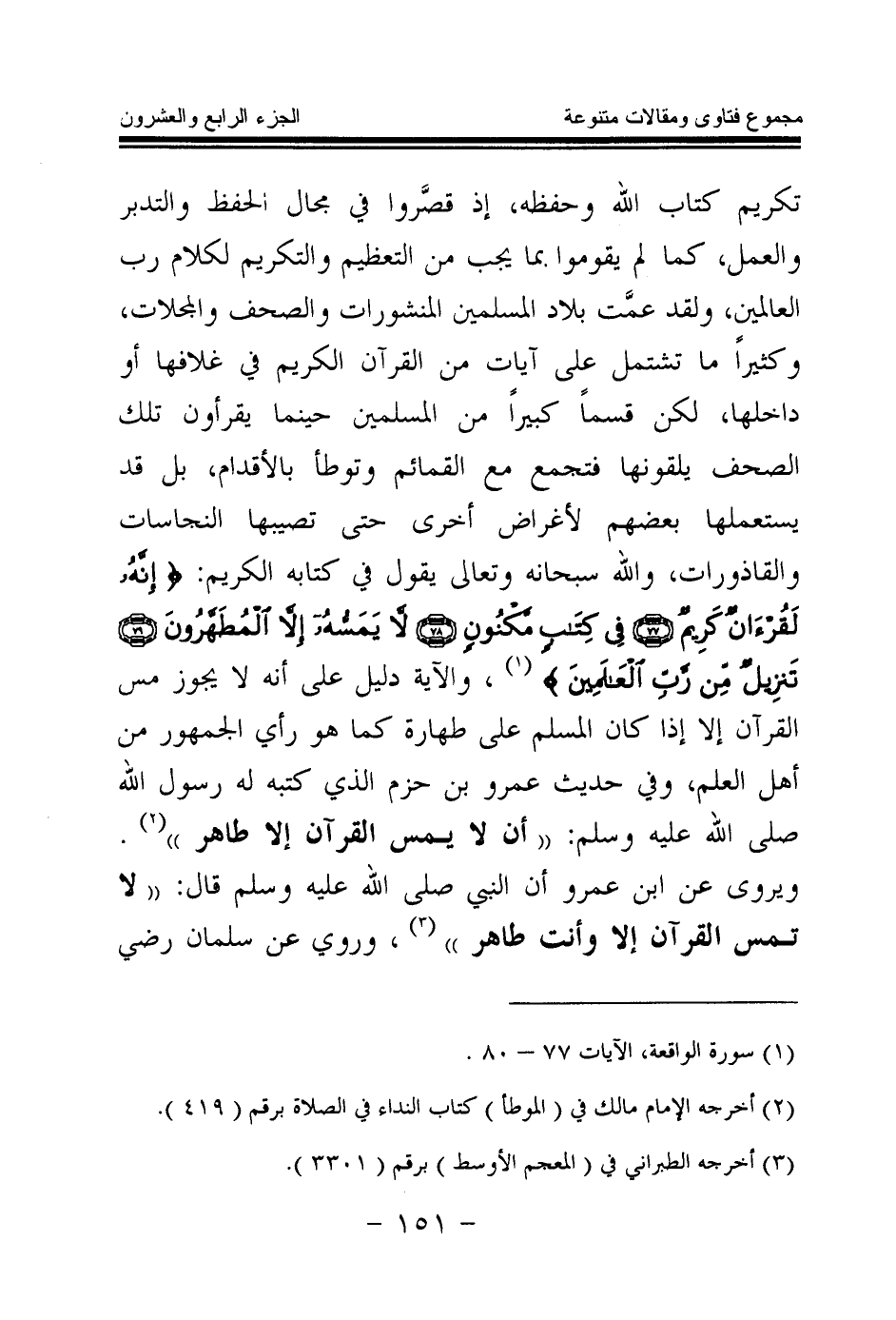 تكريم كتاب الله وحفظه، إذ قصروا في مجال الحفظ والتدبر والعمل، كما لم يقوموا بما يجب من التعظيم والتكريم لكلام رب العالمين، ولقد عمت بلاد المسلمين المنشورات والصحف والمجلات، وكثيرا ما تشتمل على آيات من القرآن الكريم في غلافها أو داخلها، لكن قسما كبيرا من المسلمين حينما يقرءون تلك الصحف يلقونها فتجمع مع القمائم وتوطأ بالأقدام، بل قد يستعملها بعضهم لأغراض أخرى حتى تصيبها النجاسات والقاذورات، والله سبحانه وتعالى يقول في كتابه الكريم: {إِنَّهُ لَقُرْآنٌ كَرِيمٌ} (¬1) {فِي كِتَابٍ مَكْنُونٍ} (¬2) {لَا يَمَسُّهُ إِلَّا الْمُطَهَّرُونَ} (¬3) {تَنْزِيلٌ مِنْ رَبِّ الْعَالَمِينَ} (¬4) والآية دليل على أنه لا يجوز مس القرآن إلا إذا كان المسلم على طهارة كما هو رأي الجمهور من أهل العلم، وفي حديث عمرو بن حزم الذي كتبه له رسول الله صلى الله عليه وسلم: «أن لا يمس القرآن إلا طاهر (¬5) » .