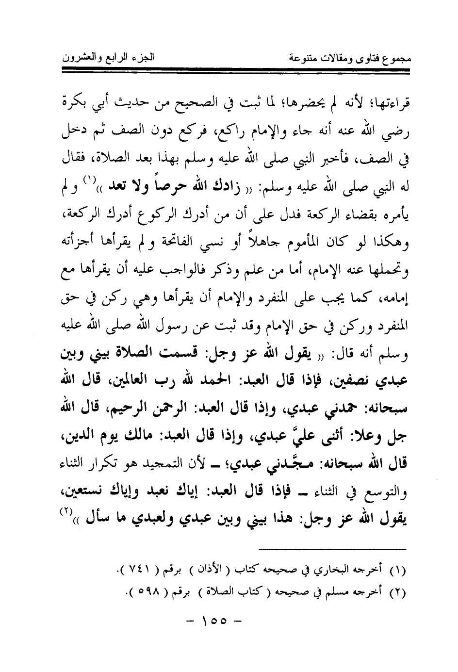 قراءتها؛ لأنه لم يحضرها؛ لما ثبت في الصحيح من حديث أبي بكرة رضي الله عنه أنه جاء والإمام راكع، فركع دون الصف ثم دخل في الصف، فأخبر النبي صلى الله عليه وسلم بهذا بعد الصلاة، فقال له النبي صلى الله عليه وسلم: «زادك الله حرصا ولا تعد (¬1) » . ولم يأمره بقضاء الركعة فدل على أن من أدرك الركوع أدرك الركعة، وهكذا لو كان المأموم جاهلا أو نسي الفاتحة ولم يقرأها أجزأته وتحملها عنه الإمام، أما من علم وذكر فالواجب عليه أن يقرأها مع إمامه، كما يجب على المنفرد والإمام أن يقرأها وهي ركن في حق المنفرد وركن في حق الإمام وقد ثبت عن رسول الله صلى الله عليه وسلم أنه قال: «يقول الله عز وجل: قسمت الصلاة بيني وبين عبدي نصفين، فإذا قال العبد: الحمد لله رب العالمين، قال الله سبحانه: حمدني عبدي، وإذا قال العبد: الرحمن الرحيم، قال الله جل وعلا: أثنى علي عبدي، وإذا قال العبد: مالك يوم الدين، قال الله سبحانه: مجدني عبدي؛ - لأن التمجيد هو تكرار الثناء والتوسع في الثناء- فإذا قال العبد: إياك نعبد وإياك نستعين، يقول الله عز وجل: هذا بيني وبين عبدي ولعبدي ما سأل (¬2) » .