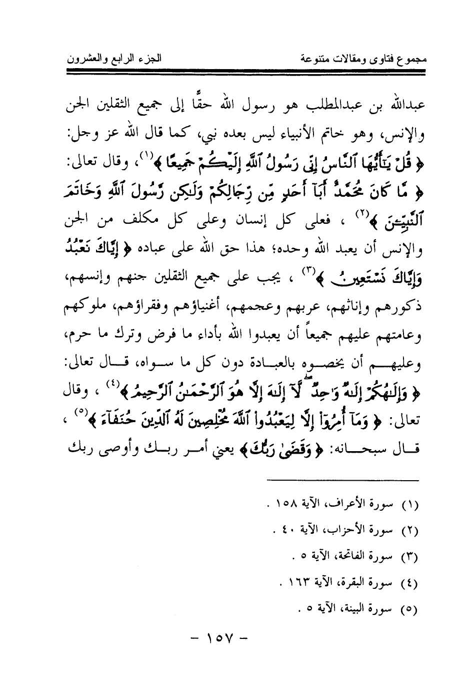 عبد الله بن عبد المطلب هو رسول الله حقا إلى جميع الثقلين الجن والإنس، وهو خاتم الأنبياء ليس بعده نبي، كما قال الله عز وجل: {قُلْ يَا أَيُّهَا النَّاسُ إِنِّي رَسُولُ اللَّهِ إِلَيْكُمْ جَمِيعًا} (¬1) وقال تعالى: {مَا كَانَ مُحَمَّدٌ أَبَا أَحَدٍ مِنْ رِجَالِكُمْ وَلَكِنْ رَسُولَ اللَّهِ وَخَاتَمَ النَّبِيِّينَ} (¬2) فعلى كل إنسان وعلى كل مكلف من الجن والإنس أن يعبد الله وحده؛ هذا حق الله على عباده {إِيَّاكَ نَعْبُدُ وَإِيَّاكَ نَسْتَعِينُ} (¬3) يجب على جميع الثقلين جنهم وإنسهم، ذكورهم وإناثهم، عربهم وعجمهم، أغنياؤهم وفقراؤهم، ملوكهم وعامتهم عليهم جميعا أن يعبدوا الله بأداء ما فرض وترك ما حرم، وعليهم أن يخصوه بالعبادة دون كل ما سواه، قال تعالى: {وَإِلَهُكُمْ إِلَهٌ وَاحِدٌ لَا إِلَهَ إِلَّا هُوَ الرَّحْمَنُ الرَّحِيمُ} (¬4) وقال تعالى: {وَمَا أُمِرُوا إِلَّا لِيَعْبُدُوا اللَّهَ مُخْلِصِينَ لَهُ الدِّينَ حُنَفَاءَ} (¬5) قال سبحانه: {وَقَضَى رَبُّكَ} (¬6) يعني أمر ربك وأوصى ربك